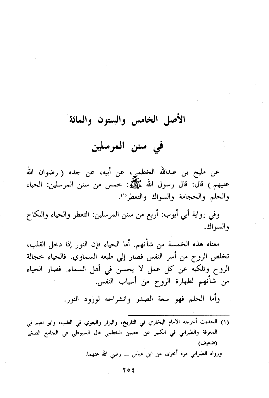 عَن مليح بن عبد الله الخطمي عَن أَبِيه عَن جده رضوَان الله عَلَيْهِم قَالَ قَالَ رَسُول الله صلى الله عَلَيْهِ وَسلم خمس من سنَن الْمُرْسلين الْحيَاء والحلم والحجامة والسواك والتعطر