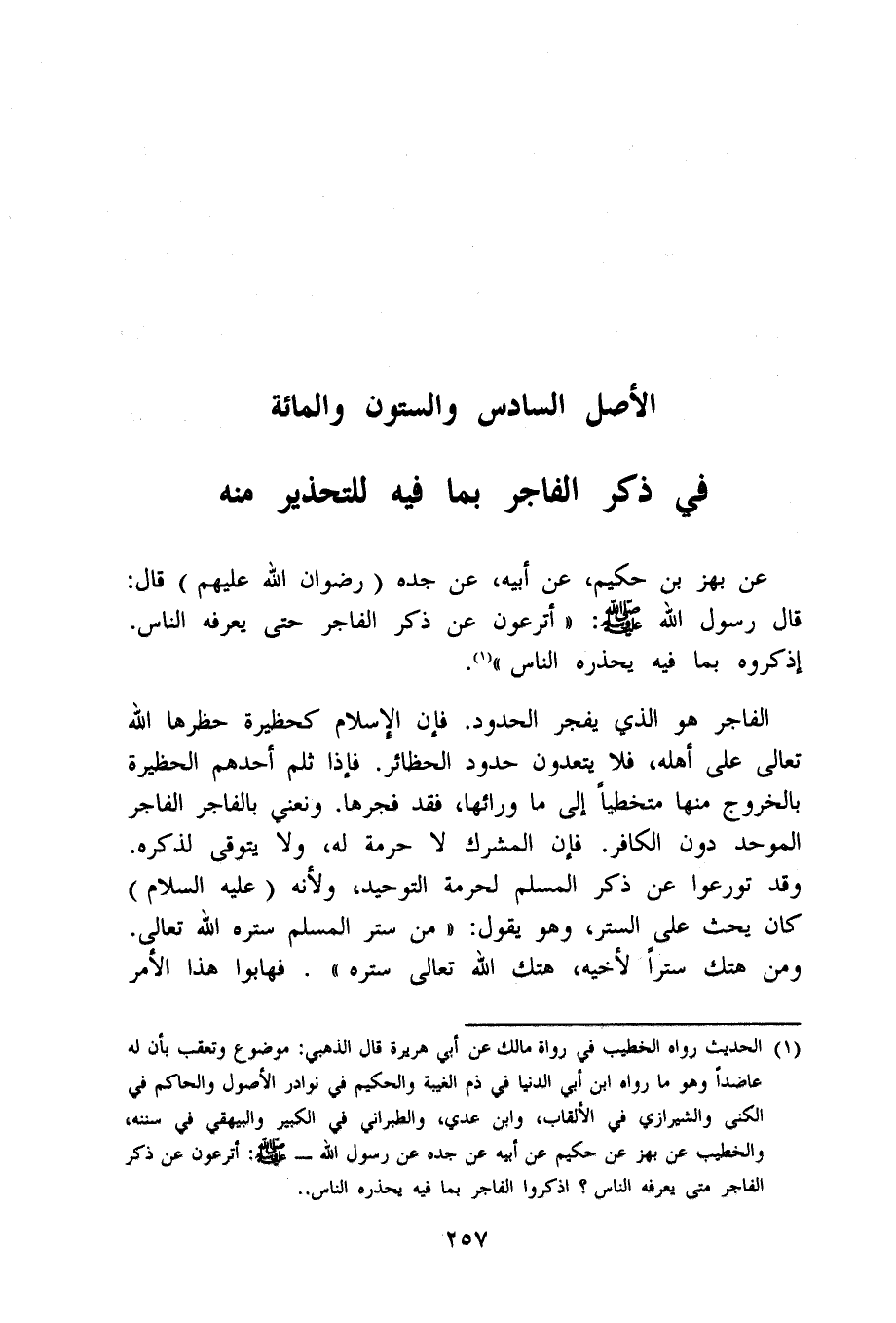 عَن بهز بن حَكِيم عَن أَبِيه عَن جده رضوَان الله عَلَيْهِم قَالَ قَالَ رَسُول الله صلى الله عَلَيْهِ وَسلم أَتَرْعَوْنَ عَن ذكر الْفَاجِر حَتَّى يعرفهُ النَّاس إذكروه بِمَا فِيهِ يحذرهُ النَّاس