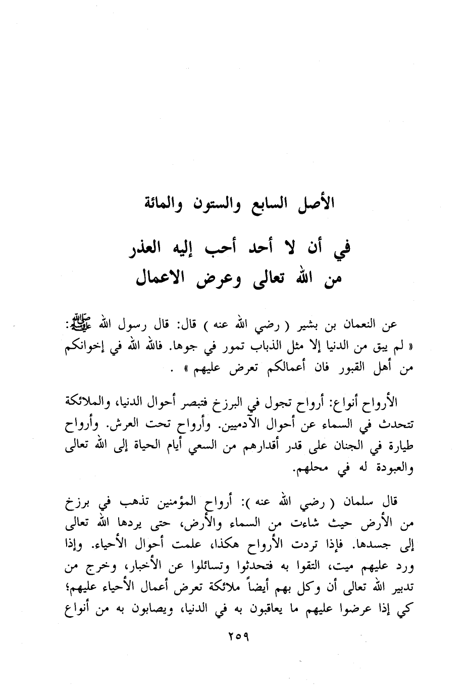 قَالَ سلمَان رَضِي الله عَنهُ أَرْوَاح الْمُؤمنِينَ تذْهب فِي بزرخ من الأَرْض حَيْثُ شَاءَت من السَّمَاء وَالْأَرْض حَتَّى يردهَا الله تَعَالَى إِلَى جَسدهَا فَإِذا تردت الْأَرْوَاح هَكَذَا علمت أَحْوَال الْأَحْيَاء وَإِذا ورد عَلَيْهِم ميت الْتَقَوْا بِهِ فتحدثوا وتسائلوا عَن الْأَخْبَار وَخرج من تَدْبِير الله تَعَالَى أَن وكل بهم أَيْضا مَلَائِكَة تعرض أَعمال الْأَحْيَاء عَلَيْهِم كي إِذا عرضوا عَلَيْهِم مَا يعاقبون بِهِ فِي الدُّنْيَا ويصابون بِهِ من أَنْوَاع
