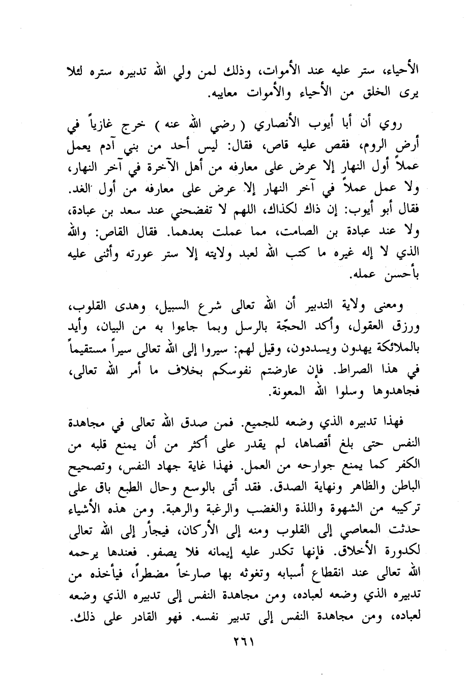فَهَذَا تَدْبيره الَّذِي وَضعه للْجَمِيع فَمن صدق الله تَعَالَى فِي مجاهدة النَّفس حَتَّى بلغ أقصاها لم يقدر على أَكثر من أَن يمْنَع قلبه من الْكفْر كَمَا يمْنَع جوارحه من الْعَمَل فَهَذَا غَايَة جِهَاد النَّفس وَتَصْحِيح الْبَاطِن وَالظَّاهِر وَنِهَايَة الصدْق فقد أَتَى بالوسع وَحَال الطَّبْع بَاقٍ على تركيبه من الشَّهْوَة واللذة وَالْغَضَب وَالرَّغْبَة والرهبة وَمن هَذِه الْأَشْيَاء حدثت الْمعاصِي إِلَى الْقُلُوب وَمِنْه إِلَى الْأَركان فيجأر إِلَى الله تَعَالَى لكدورة الْأَخْلَاق فَإِنَّهَا تكدر عَلَيْهِ إيمَانه فَلَا يصفو فَعندهَا يرحمه الله تَعَالَى عِنْد انْقِطَاع أَسبَابه وتغوثه بهَا صَارِخًا مُضْطَرّا فَيَأْخذهُ من تَدْبيره الَّذِي وَضعه لِعِبَادِهِ وَمن مجاهدة النَّفس إِلَى تَدْبيره الَّذِي وَضعه لِعِبَادِهِ وَمن مجاهدة النَّفس إِلَى تَدْبِير نَفسه فَهُوَ الْقَادِر على ذَلِك