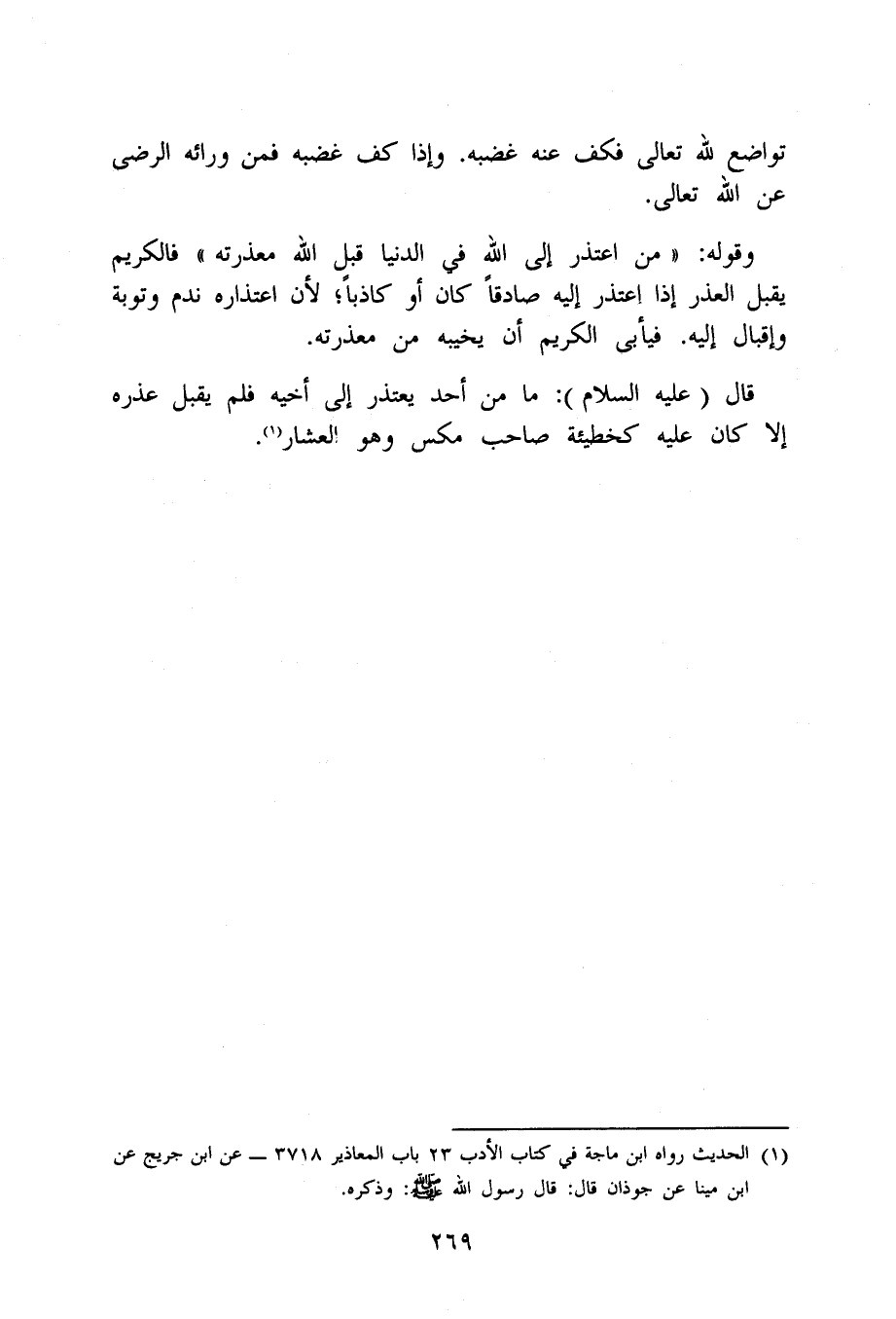 قَالَ صلى الله عَلَيْهِ وَسلم مَا من أحد يعْتَذر إِلَى أَخِيه فَلم يقبل عذره إِلَّا كَانَ عَلَيْهِ كخطيئة صَاحب مكس وَهُوَ العشار