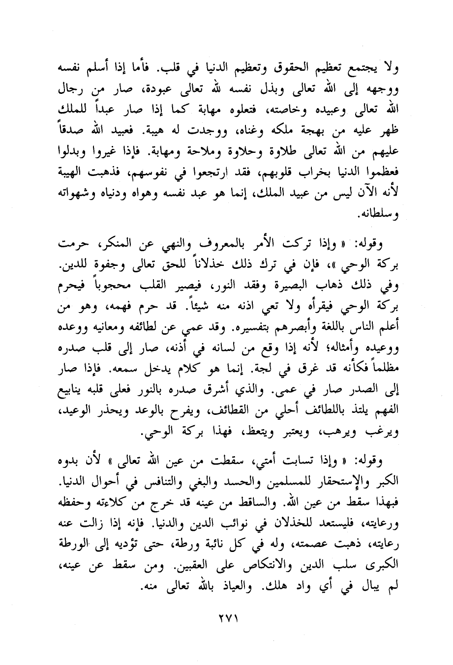 وَقَوله وَإِذا تركت الْأَمر بِالْمَعْرُوفِ وَالنَّهْي عَن الْمُنكر حرمت بركَة الْوَحْي فَإِن فِي ترك ذَلِك خذلانا للحق تَعَالَى وجفوة للدّين وَفِي ذَلِك ذهَاب البصيرة وفقد النُّور فَيصير الْقلب محجوبا فَيحرم بركَة الْوَحْي فيقرأه وَلَا تعي اذنه مِنْهُ شَيْئا قد حرم فهمه وَهُوَ من أعلم النَّاس باللغة وأبصرهم بتفسيره وَقد عمي عَن لطائفه ومعانيه ووعده ووعيده وَأَمْثَاله لِأَنَّهُ إِذا وَقع من لِسَانه فِي أُذُنه صَار إِلَى قلب صَدره مظلما فَكَأَنَّهُ قد غرق فِي لجة إِنَّمَا هُوَ كَلَام يدْخل سَمعه فَإِذا صَار إِلَى الصَّدْر صَار فِي عمى وَالَّذِي أشرق صَدره بِالنورِ فعلى قلبه ينابيع الْفَهم يلتذ باللطائف أحلى من القطائف ويفرح بالوعد ويحذر الْوَعيد ويرغب ويرهب وَيعْتَبر ويتعظ فَهَذَا بركَة الْوَحْي