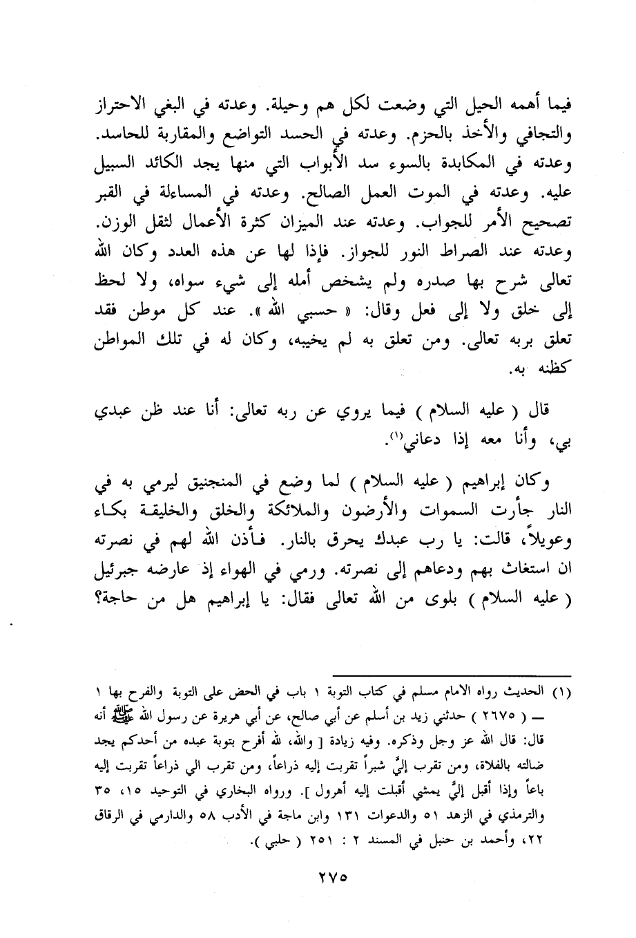 فِيمَا أهمه الْحِيَل الَّتِي وضعت لكل هم وحيلة وعدته فِي الْبَغي الِاحْتِرَاز والتجافي وَالْأَخْذ بالحزم وعدته فِي الْحَسَد التَّوَاضُع والمقاربة للحاسد وعدته فِي المكابدة بالسوء سد الْأَبْوَاب الَّتِي مِنْهَا يجد الكائد السَّبِيل عَلَيْهِ وعدته فِي الْمَوْت الْعَمَل الصَّالح وعدته فِي المساءلة فِي الْقَبْر تَصْحِيح الْأَمر للجواب وعدته عِنْد الْمِيزَان كَثْرَة الْأَعْمَال لثقل الْوَزْن وعدته عِنْد الصِّرَاط النُّور للْجُوَاز فَإِذا لَهَا عَن هَذِه الْعدَد وَكَانَ الله تَعَالَى شرح بهَا صَدره وَلم يشخص أمله إِلَى شَيْء سواهُ وَلَا لحظ إِلَى خلق وَلَا إِلَى فعل وَقَالَ حسبي الله عِنْد كل موطن فقد تعلق بربه تَعَالَى وَمن تعلق بِهِ لم يخيبه وَكَانَ لَهُ فِي تِلْكَ المواطن كظنه بِهِ