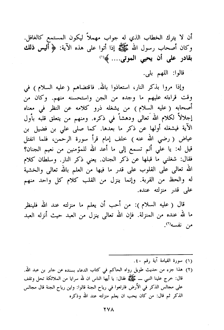 وَإِذا مروا بِذكر النَّار استعاذوا بِاللَّه فاقتضاهم صلى الله عَلَيْهِ وَسلم فِي وَقت قِرَاءَته عَلَيْهِم مَا وجده من الْجِنّ وَاسْتَحْسنهُ مِنْهُم وَكَانَ من أَصْحَابه صلى الله عَلَيْهِ وَسلم من يشْغلهُ ذرو كَلَامه عَن النّظر فِي مَعْنَاهُ إجلالا لكَلَام الله تَعَالَى ودهشا فِي ذكره وَمِنْهُم من يتَعَلَّق قلبه بِأول الْآيَة فيشغله أَولهَا عَن ذكر مَا بعْدهَا كَمَا صلى عَليّ بن فُضَيْل بن عِيَاض رَضِي الله عَنهُ خلف إِمَام قَرَأَ سُورَة الرَّحْمَن فَلَمَّا انْفَتَلَ قيل لَهُ يَا عَليّ ألم تسمع إِلَى مَا أعد الله للْمُؤْمِنين من نعيم الْجنان فَقَالَ شغلني مَا قبلهَا عَن ذكر الْجنان يَعْنِي ذكر النَّار وسلطان كَلَام الله تَعَالَى على الْقُلُوب على قدر مَا فِيهَا من الْعلم بِاللَّه تَعَالَى والخشية لَهُ والحظ من الْقرْبَة وَإِنَّمَا ينزل من الْقلب كَلَام كل وَاحِد مِنْهُم على قدر مَنْزِلَته عِنْده