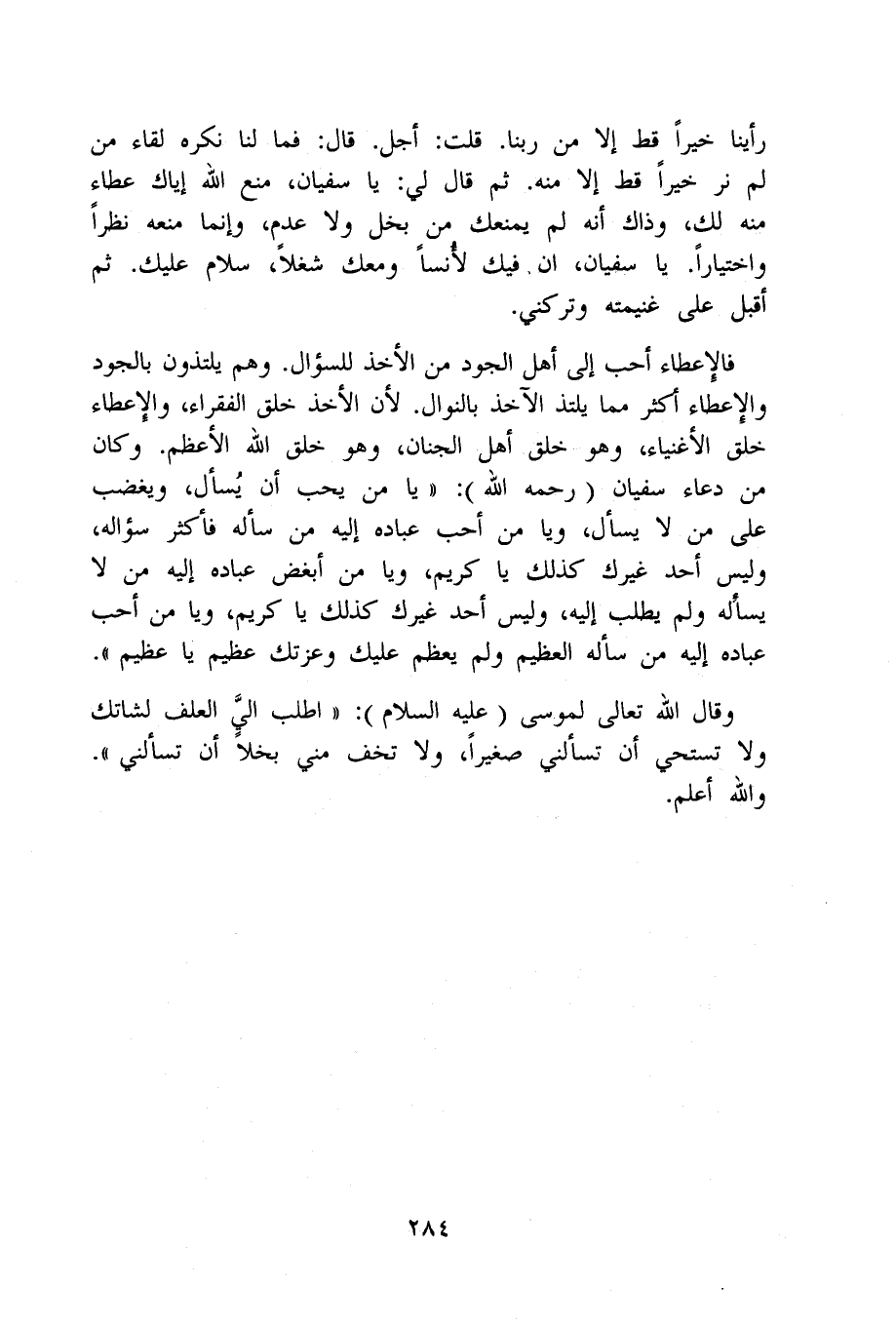 رَأينَا خيرا قطّ إِلَّا من رَبنَا قلت أجل قَالَ فَمَا لنا نكره لِقَاء من لم نر خيرا قطّ إِلَّا مِنْهُ ثمَّ قَالَ لي يَا سُفْيَان منع الله إياك عَطاء مِنْهُ لَك وَذَاكَ أَنه لم يمنعك من بخل وَلَا عدم وَإِنَّمَا مَنعه نظرا واختيارا يَا سُفْيَان ان فِيك لأنسا ومعك شغلا سَلام عَلَيْك ثمَّ أقبل على غنيمته وَتَرَكَنِي