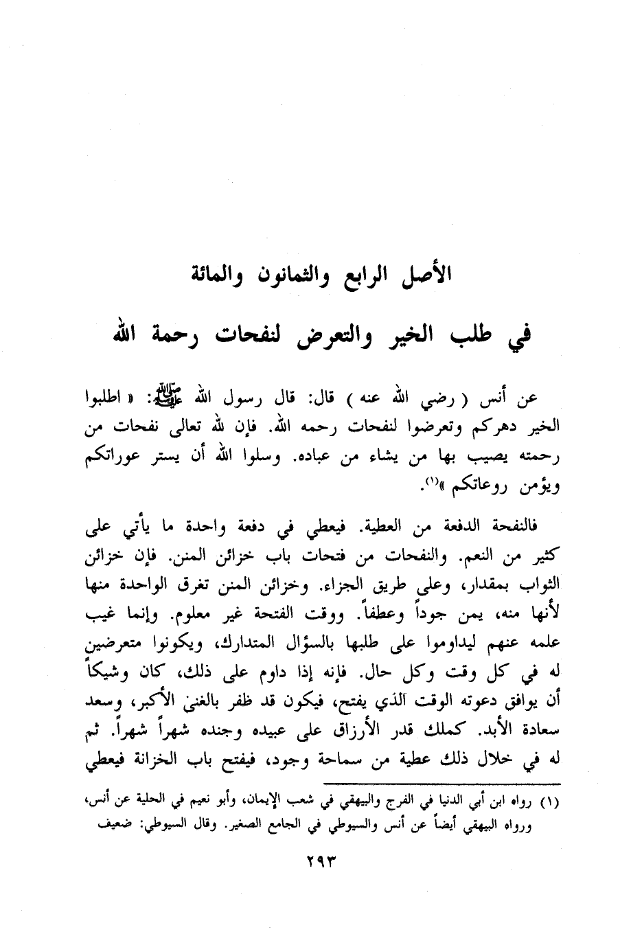 عَن أنس رَضِي الله عَنهُ قَالَ قَالَ رَسُول الله صلى الله عَلَيْهِ وَسلم اطْلُبُوا الْخَيْر دهركم وتعرضوا لنفحات رَحمَه الله فَإِن لله تَعَالَى نفحات من رَحمته يُصِيب بهَا من يَشَاء من عباده وسلوا الله أَن يستر عوراتكم ويؤمن روعاتكم