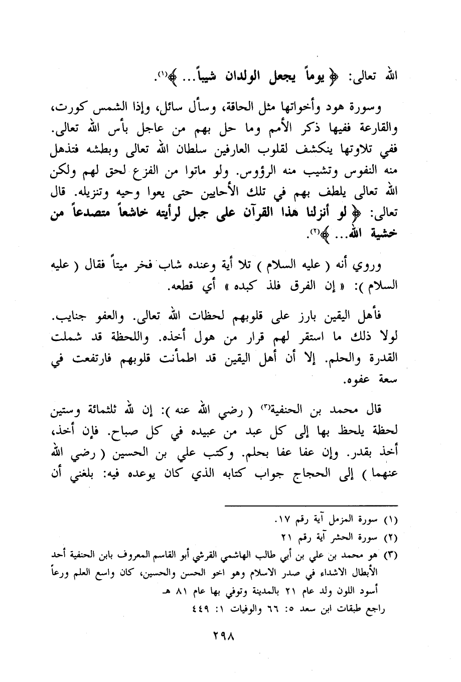 قَالَ مُحَمَّد بن الْحَنَفِيَّة رَضِي الله عَنهُ إِن لله ثلثمِائة وَسِتِّينَ لَحْظَة يلحظ بهَا إِلَى كل عبد من عبيده فِي كل صباح فَإِن أَخذ أَخذ بِقدر وَإِن عَفا عَفا بحلم وَكتب عَليّ بن الْحُسَيْن رَضِي الله عَنْهُمَا إِلَى الْحجَّاج جَوَاب كِتَابه الَّذِي كَانَ يوعده فِيهِ بَلغنِي أَن