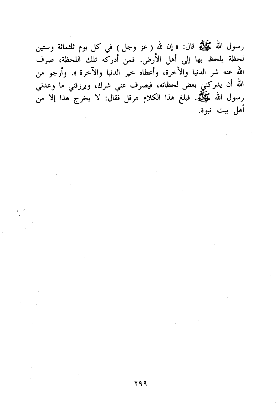 رَسُول الله صلى الله عَلَيْهِ وَسلم قَالَ إِن لله عز وَجل فِي كل يَوْم ثلثمِائة وَسِتِّينَ لَحْظَة يلحظ بهَا إِلَى أهل الأَرْض فَمن أدْركهُ تِلْكَ اللحظة صرف الله عَنهُ شَرّ الدُّنْيَا وَالْآخِرَة وَأَعْطَاهُ خير الدُّنْيَا وَالْآخِرَة وَأَرْجُو من الله أَن يدركني بعض لحظاته فَيصْرف عني شرك ويرزقني مَا وَعَدَني رَسُول الله صلى الله عَلَيْهِ وَسلم فَبلغ هَذَا الْكَلَام هِرقل فَقَالَ لَا يخرج هَذَا إِلَّا من أهل بَيت نبوة
