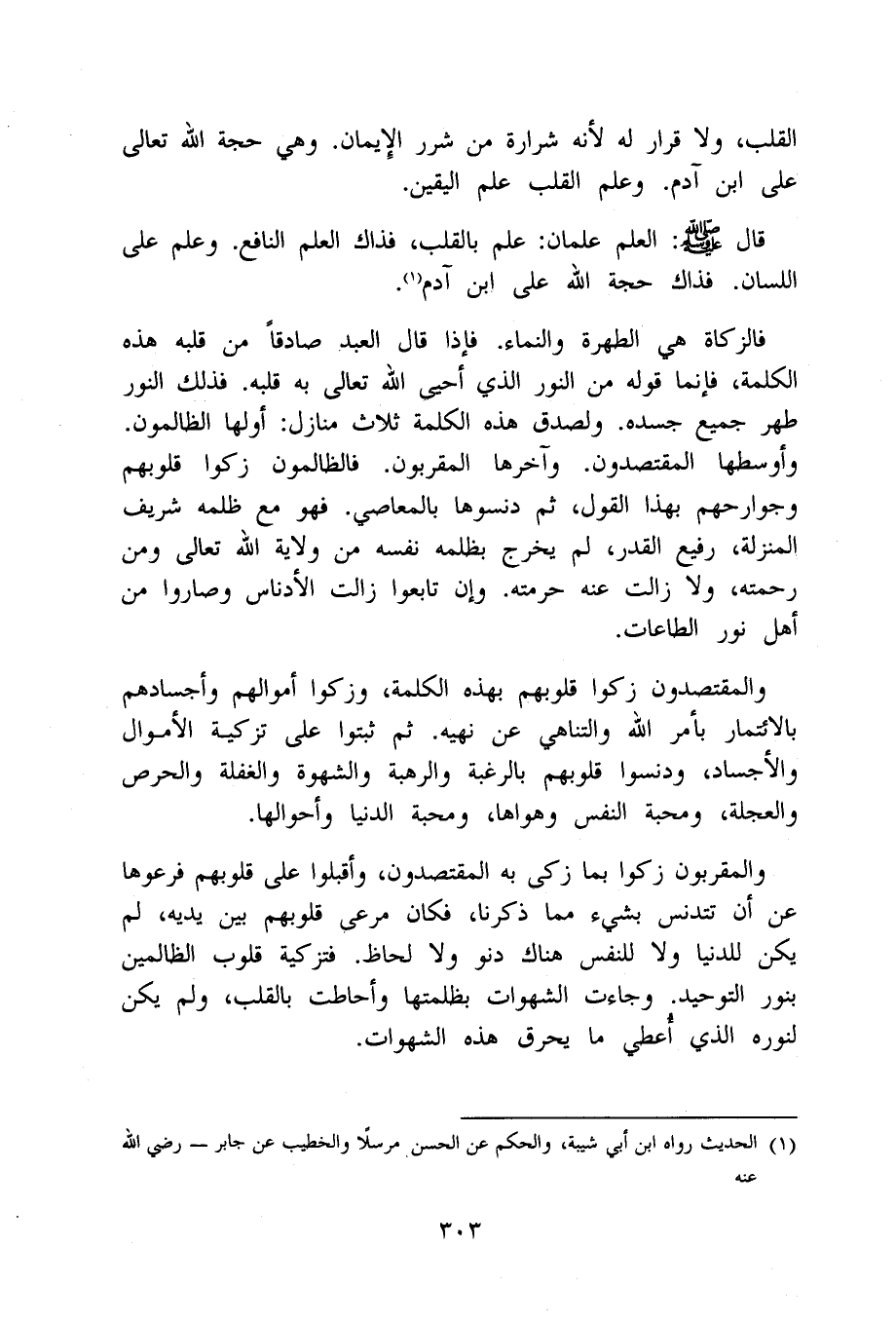 فالزكاة هِيَ الطهرة والنماء فَإِذا قَالَ العَبْد صَادِقا من قلبه هَذِه الْكَلِمَة فَإِنَّمَا قَوْله من النُّور الَّذِي أحيى الله تَعَالَى بِهِ قلبه فَذَلِك النُّور طهر جَمِيع جسده ولصدق هَذِه الْكَلِمَة ثَلَاث منَازِل أَولهَا الظَّالِمُونَ وأوسطها المقتصدون وَآخِرهَا المقربون فالظالمون زكوا قُلُوبهم وجوارحهم بِهَذَا القَوْل ثمَّ دنسوها بِالْمَعَاصِي فَهُوَ مَعَ ظلمه شرِيف الْمنزلَة رفيع الْقدر لم يخرج بظلمه نَفسه من ولَايَة الله تَعَالَى وَمن رَحمته وَلَا زَالَت عَنهُ حرمته وَإِن تابعوا زَالَت الأدناس وصاروا من أهل نورالطاعات