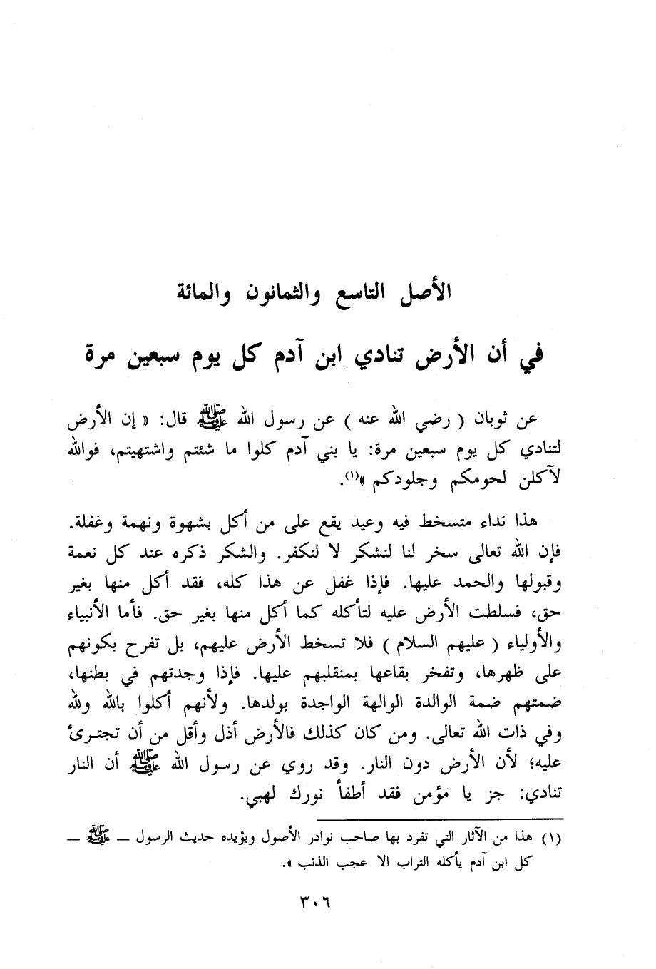 عَن ثَوْبَان رَضِي الله عَنهُ عَن رَسُول الله صلى الله عَلَيْهِ وَسلم قَالَ إِن الأَرْض لتنادي كل يَوْم سبعين مرّة يَا بني آدم كلوا مَا شِئْتُم واشتهيتم فوَاللَّه لاكلن لحومكم وجلودكم