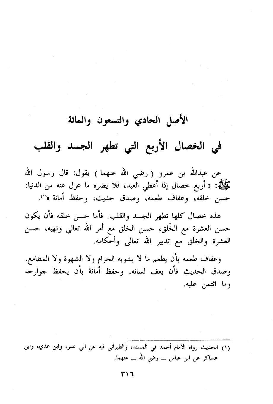 عَن عبد الله بن عَمْرو رَضِي الله عَنْهُمَا يَقُول قَالَ رَسُول الله صلى الله عَلَيْهِ وَسلم أَربع خِصَال إِذا أعطي العَبْد فَلَا يضرّهُ مَا عزل عَنهُ من الدُّنْيَا حسن خلقه وعفاف طعمه وَصدق حَدِيث وَحفظ أَمَانَة