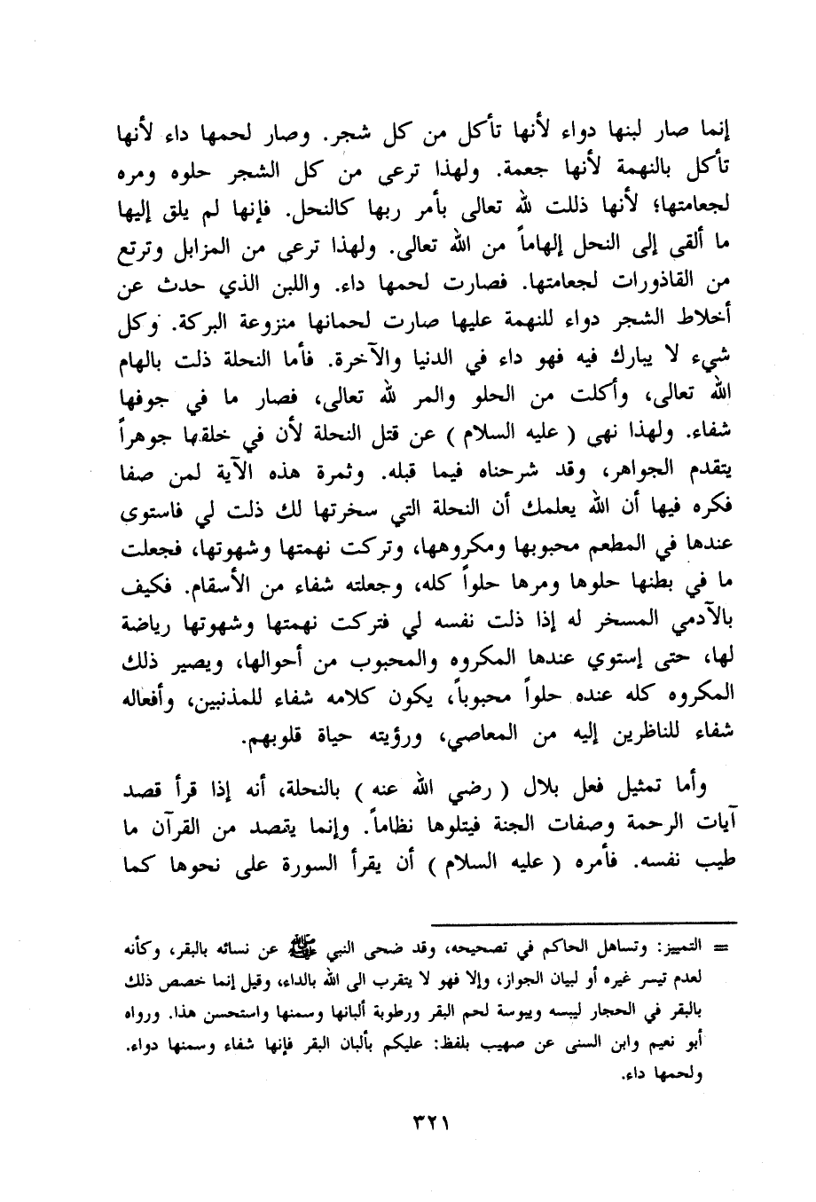إِنَّمَا صَار لَبنهَا دَوَاء لِأَنَّهَا تَأْكُل من كل شجر وَصَارَ لَحمهَا دَاء لِأَنَّهَا تَأْكُل بالنهمة لِأَنَّهَا جعمة وَلِهَذَا ترعى من كل الشّجر حلوه ومره لجعامتها لِأَنَّهَا ذللت لله تَعَالَى بِأَمْر رَبهَا كالنحل فَإِنَّهَا لم يلق إِلَيْهَا مَا ألقِي إِلَى النَّحْل إلهاما من الله تَعَالَى وَلِهَذَا ترعى من الْمَزَابِل وترتع من القاذورات لجعامتها فَصَارَت لَحمهَا دَاء وَاللَّبن الَّذِي حدث عَن أخلاط الشّجر دَوَاء للنهمة عَلَيْهَا صَارَت لحمانها منزوعة الْبركَة وكل شَيْء لَا يُبَارك فِيهِ فَهُوَ دَاء فِي الدُّنْيَا وَالْآخِرَة فَأَما النحلة ذلت بالهام الله تَعَالَى وأكلت من الحلو والمر لله تَعَالَى فَصَارَ مَا فِي جوفها شِفَاء وَلِهَذَا نهى صلى الله عَلَيْهِ وَسلم عَن قتل النحلة لِأَن فِي خلقهَا جوهرا يتَقَدَّم الْجَوَاهِر وَقد شرحناه فِيمَا قبله وَثَمَرَة هَذِه الْآيَة لمن صفا فكره فِيهَا أَن الله يعلمك أَن النحلة الَّتِي سخرتها لَك ذلت لي فَاسْتَوَى عِنْدهَا فِي الْمطعم محبوبها ومكروهها وَتركت نهمتها وشهوتها فَجعلت مَا فِي بَطنهَا حلوها ومرها حلوا كُله وَجَعَلته شِفَاء من الأسقام فَكيف بالآدمي المسخر لَهُ إِذا ذلت نَفسه لي فَتركت نهمتها وشهوتها رياضة لَهَا حَتَّى إستوي عِنْدهَا الْمَكْرُوه والمحبوب من أحوالها وَيصير ذَلِك الْمَكْرُوه كُله عِنْده حلوا محبوبا يكون كَلَامه شِفَاء للمذنبين وأفعاله شِفَاء للناظرين إِلَيْهِ من الْمعاصِي ورؤيته حَيَاة قُلُوبهم
