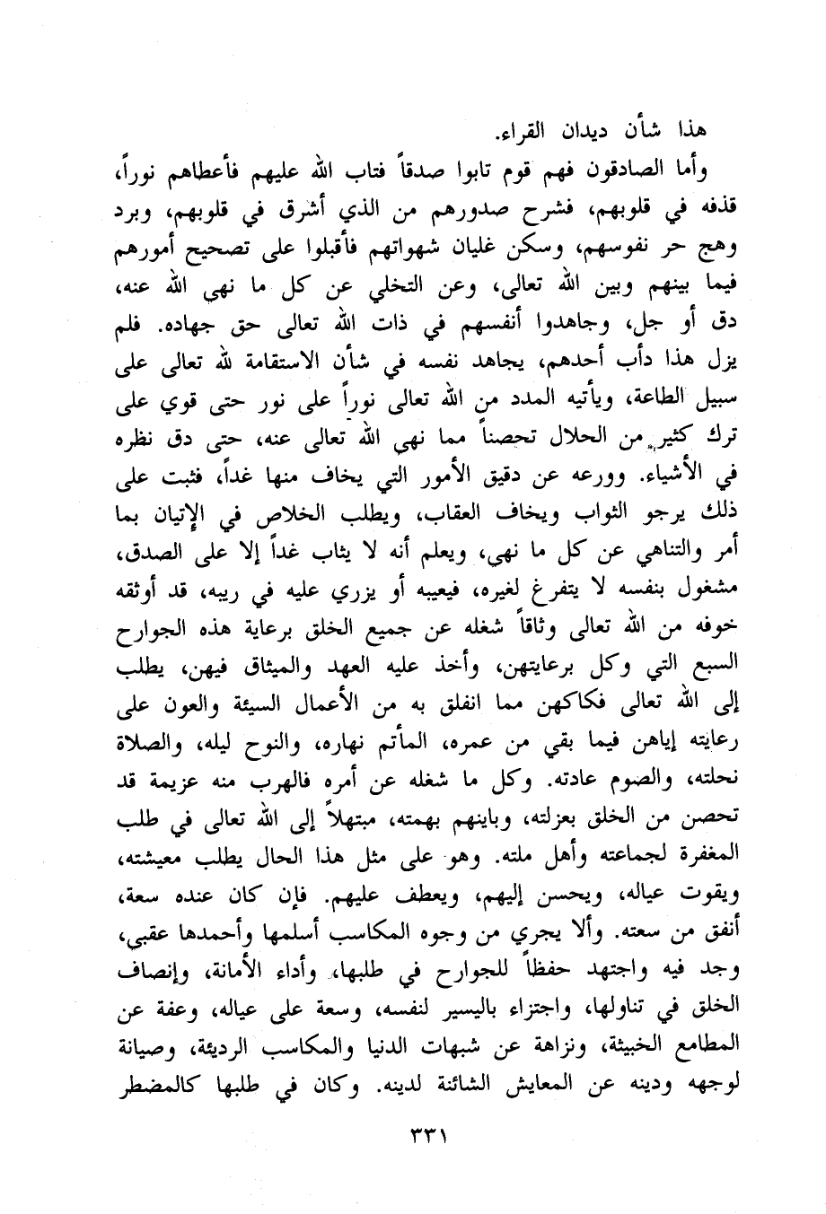 وَأما الصادقون فهم قوم تَابُوا صدقا فَتَابَ الله عَلَيْهِم فَأَعْطَاهُمْ نورا قذفه فِي قُلُوبهم فشرح صُدُورهمْ من الَّذِي أشرق فِي قُلُوبهم وَبرد وهج حر نُفُوسهم وَسكن غليان شهواتهم فَأَقْبَلُوا على تَصْحِيح أُمُورهم فِيمَا بَينهم وَبَين الله تَعَالَى وَعَن التخلي عَن كل مَا نهى الله عَنهُ دق أَو جلّ وَجَاهدُوا أنفسهم فِي ذَات الله تَعَالَى حق جهاده فَلم يزل هَذَا دأب أحدهم يُجَاهد نَفسه فِي شَأْن الاسْتقَامَة لله تَعَالَى على سَبِيل الطَّاعَة ويأتيه المدد من الله تَعَالَى نورا على نور حَتَّى قوي على ترك كثير من الْحَلَال تَحَصُّنًا مِمَّا نهى الله تَعَالَى عَنهُ حَتَّى دق نظره فِي الْأَشْيَاء وورعه عَن دَقِيق الْأُمُور الَّتِي يخَاف مِنْهَا غَدا فَثَبت على ذَلِك يَرْجُو الثَّوَاب وَيخَاف الْعقَاب وَيطْلب الْخَلَاص فِي الْإِتْيَان بِمَا امْر والتناهي عَن كل مَا نهى وَيعلم أَنه لَا يُثَاب غَدا إِلَّا على الصدْق مَشْغُول بِنَفسِهِ لَا يتفرغ لغيره فيعيبه أَو يزري عَلَيْهِ فِي ريبه قد أوثقه خَوفه من الله تَعَالَى وثاقا شغله عَن جَمِيع الْخلق برعاية هَذِه الْجَوَارِح السَّبع الَّتِي وكل برعايتهن وَأخذ عَلَيْهِ الْعَهْد والميثاق فِيهِنَّ يطْلب إِلَى الله تَعَالَى فكاكهن مِمَّا انْفَلق بِهِ من الْأَعْمَال السَّيئَة والعون على رعايته إياهن فِيمَا بَقِي من عمره المأتم نَهَاره وَالنوح ليله وَالصَّلَاة نحلته وَالصَّوْم عَادَته وكل مَا شغله عَن أمره فالهرب مِنْهُ عَزِيمَة قد تحصن من الْخلق بعزلته وباينهم بهمته مبتهلا إِلَى الله تَعَالَى فِي طلب الْمَغْفِرَة لجماعته وَأهل مِلَّته وَهُوَ على مثل هَذَا الْحَال يطْلب معيشته ويقوت عِيَاله وَيحسن إِلَيْهِم ويعطف عَلَيْهِم فَإِن كَانَ عِنْده سَعَة أنْفق من سعته وَألا يجْرِي من وُجُوه المكاسب أسلمها وأحمدها عُقبى وجد فِيهِ واجتهد حفظا للجوارح فِي طلبَهَا وَأَدَاء الْأَمَانَة وإنصاف الْخلق فِي تنَاولهَا واجتزاء باليسير لنَفسِهِ وسعة على عِيَاله وعفة عَن المطامع الخبيثة ونزاهة عَن شُبُهَات الدُّنْيَا والمكاسب الرَّديئَة وصيانة لوجهه وَدينه عَن المعايش الشائنة لدينِهِ وَكَانَ فِي طلبَهَا كالمضطر