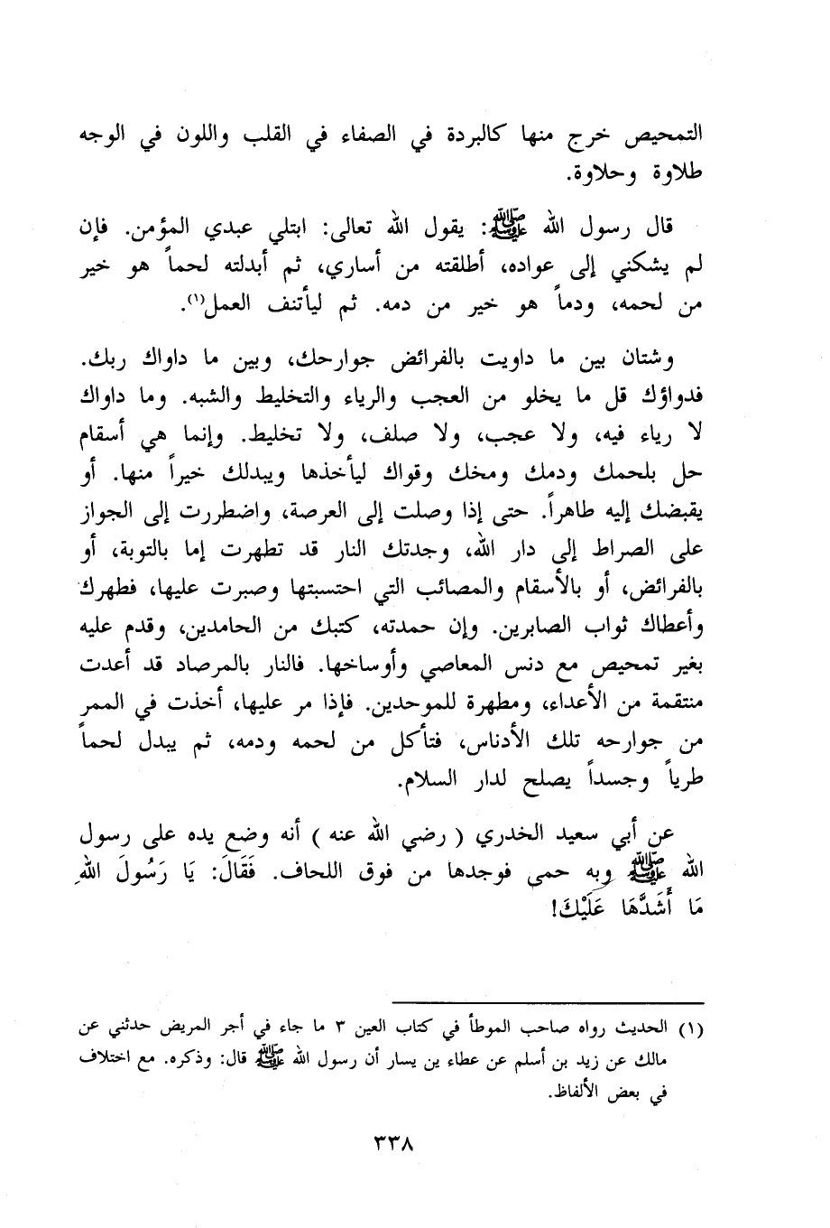 وشتان بَين مَا داويت بالفرائض جوارحك وَبَين مَا داواك رَبك فدواؤك قل مَا يَخْلُو من الْعجب والرياء والتخليط والشبه وَمَا داواك لَا رِيَاء فِيهِ وَلَا عجب وَلَا صلف ولاتخليط وَإِنَّمَا هِيَ أسقام حل بلحمك ودمك ومخك وقواك ليأخذها ويبدلك خيرا مِنْهَا أَو يقبضك إِلَيْهِ طَاهِرا حَتَّى إِذا وصلت إِلَى الْعَرَصَة واضطررت إِلَى الْجَوَاز على الصِّرَاط إِلَى دَار الله وَجَدْتُك النَّار قد تطهرت إِمَّا بِالتَّوْبَةِ أَو بالفرائض أَو بالأسقام والمصائب الَّتِي احتسبتها وَصَبَرت عَلَيْهَا فطهرك وأعطاك ثَوَاب الصابرين وَإِن حمدته كتبك من الحامدين وَقدم عَلَيْهِ بِغَيْر تمحيص مَعَ دنس الْمعاصِي وأوساخها فَالنَّار بالمرصاد قد أعدت منتقمة من الْأَعْدَاء ومطهرة للموحدين فَإِذا مر عَلَيْهَا أخذت فِي الْمَمَر من جوارحه تِلْكَ الأدناس فتأكل من لَحْمه وَدَمه ثمَّ يُبدل لَحْمًا طريا وجسدا يصلح لدار السَّلَام