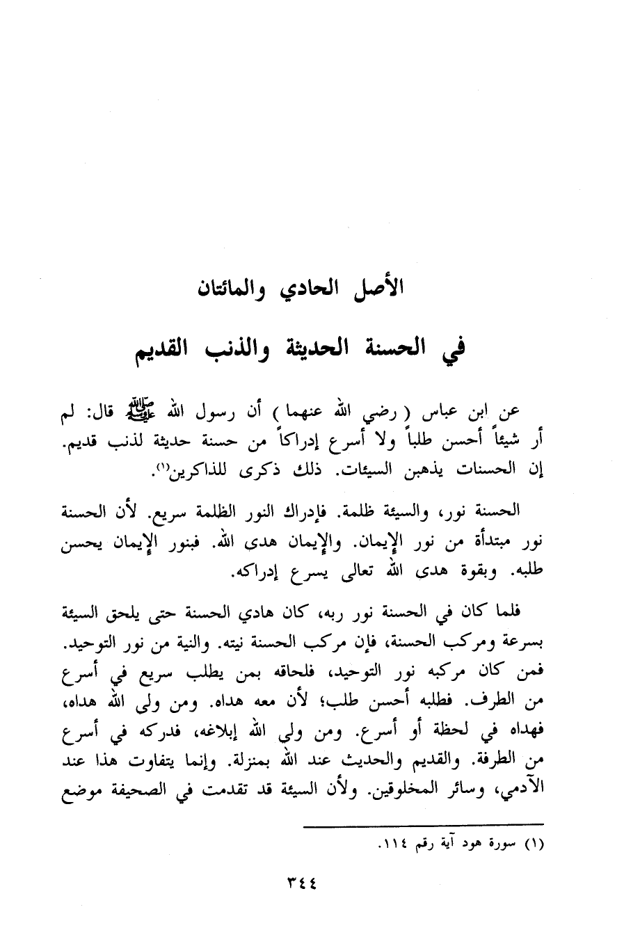 عَن ابْن عَبَّاس رَضِي الله عَنْهُمَا أَن رَسُول الله صلى الله عَلَيْهِ وَسلم قَالَ لم أر شَيْئا أحسن طلبا وَلَا أسْرع إدراكا من حَسَنَة حَدِيثَة لذنب قديم إِن الْحَسَنَات يذْهبن السَّيِّئَات ذَلِك ذكرى لِلذَّاكِرِينَ