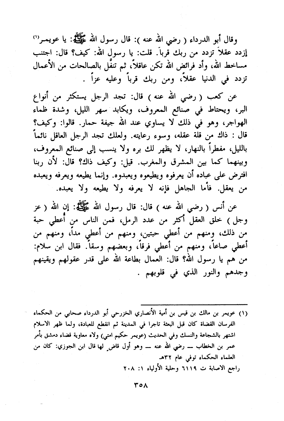 وَقَالَ أَبُو الدَّرْدَاء رَضِي الله عَنهُ قَالَ رَسُول الله صلى الله عَلَيْهِ وَسلم يَا عُوَيْمِر إزدد عقلا تَزْدَدْ من رَبك قربا قلت يَا رَسُول الله كَيفَ قَالَ اجْتنب مساخط الله وأد فَرَائض الله تكن عَاقِلا ثمَّ تنفل بالصالحات من الْأَعْمَال تَزْدَدْ فِي الدُّنْيَا عقلا وَمن رَبك قربا وَعَلِيهِ عزا