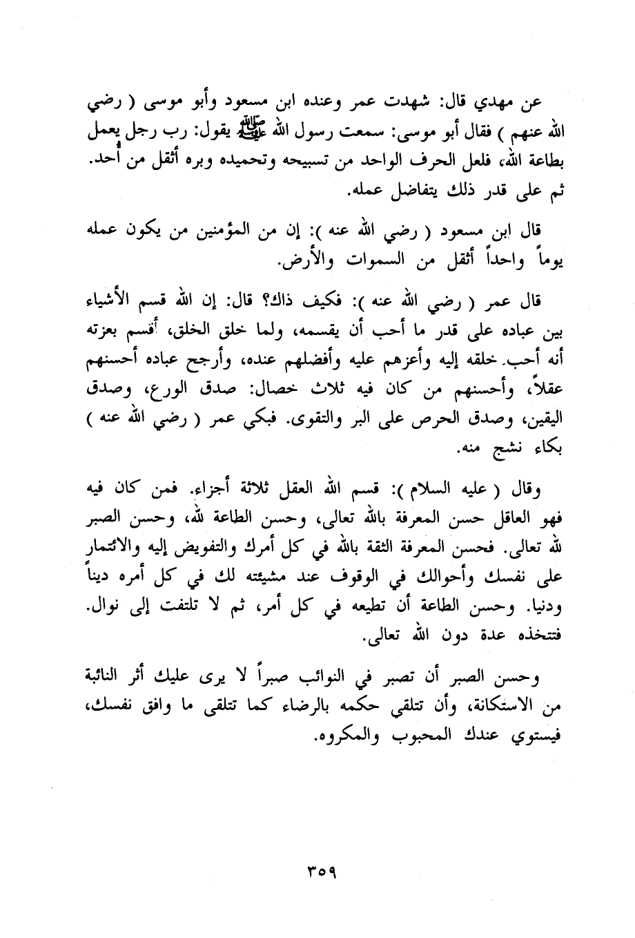 عَن مهْدي قَالَ شهِدت عمر وَعِنْده ابْن مَسْعُود وَأَبُو مُوسَى رَضِي الله عَنْهُم فَقَالَ أَبُو مُوسَى سَمِعت رَسُول الله صلى الله عَلَيْهِ وَسلم يَقُول رب رجل يعْمل بِطَاعَة الله فَلَعَلَّ الْحَرْف الْوَاحِد من تسبيحه وتحميده وبره أثقل من أحد ثمَّ على قدر ذَلِك يتفاضل عمله