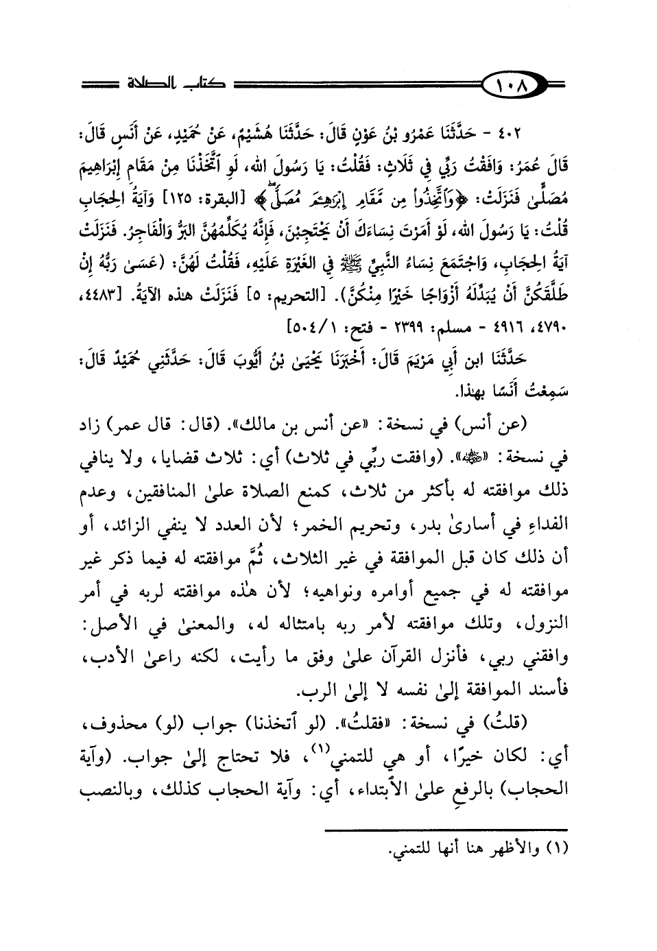 402 - حَدَّثَنَا عَمْرُو بْنُ عَوْنٍ، قَالَ: حَدَّثَنَا هُشَيْمٌ، عَنْ حُمَيْدٍ، عَنْ أَنَسِ بْنِ مَالِكٍ، قَالَ: قَالَ عُمَرُ بْنُ الخَطَّابِ رَضِيَ اللَّهُ عَنْهُ، " وَافَقْتُ رَبِّي فِي ثَلاثٍ: فَقُلْتُ يَا رَسُولَ اللَّهِ، لَو اتَّخَذْنَا مِنْ مَقَامِ إِبْرَاهِيمَ مُصَلًّى، فَنَزَلَتْ: {وَاتَّخِذُوا مِنْ مَقَامِ إِبْرَاهِيمَ مُصَلًّى} [البقرة: 125] وَآيَةُ الحِجَابِ، قُلْتُ: يَا رَسُولَ اللَّهِ، لَوْ أَمَرْتَ نِسَاءَكَ أَنْ يَحْتَجِبْنَ، فَإِنَّهُ يُكَلِّمُهُنَّ البَرُّ وَالفَاجِرُ، فَنَزَلَتْ آيَةُ الحِجَابِ، وَاجْتَمَعَ نِسَاءُ النَّبِيِّ صَلَّى اللهُ عَلَيْهِ وَسَلَّمَ فِي الغَيْرَةِ عَلَيْهِ، فَقُلْتُ لَهُنَّ: (عَسَى رَبُّهُ إِنْ طَلَّقَكُنَّ أَنْ يُبَدِّلَهُ أَزْوَاجًا خَيْرًا مِنْكُنَّ)، فَنَزَلَتْ هَذِهِ الآيَةُ.