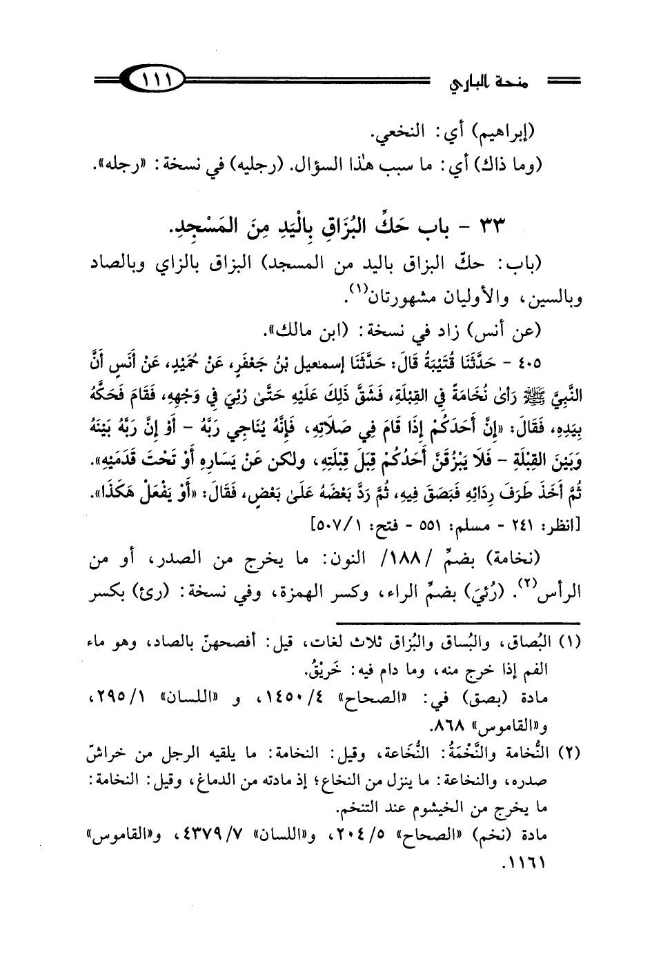 (نخامة) بضمِّ النون: ما يخرج من الصدر، أو من الرأس (¬2). (رُئيَ) بضمِّ الراء، وكسر الهمزة، وفي نسخة: (رئ) بكسر