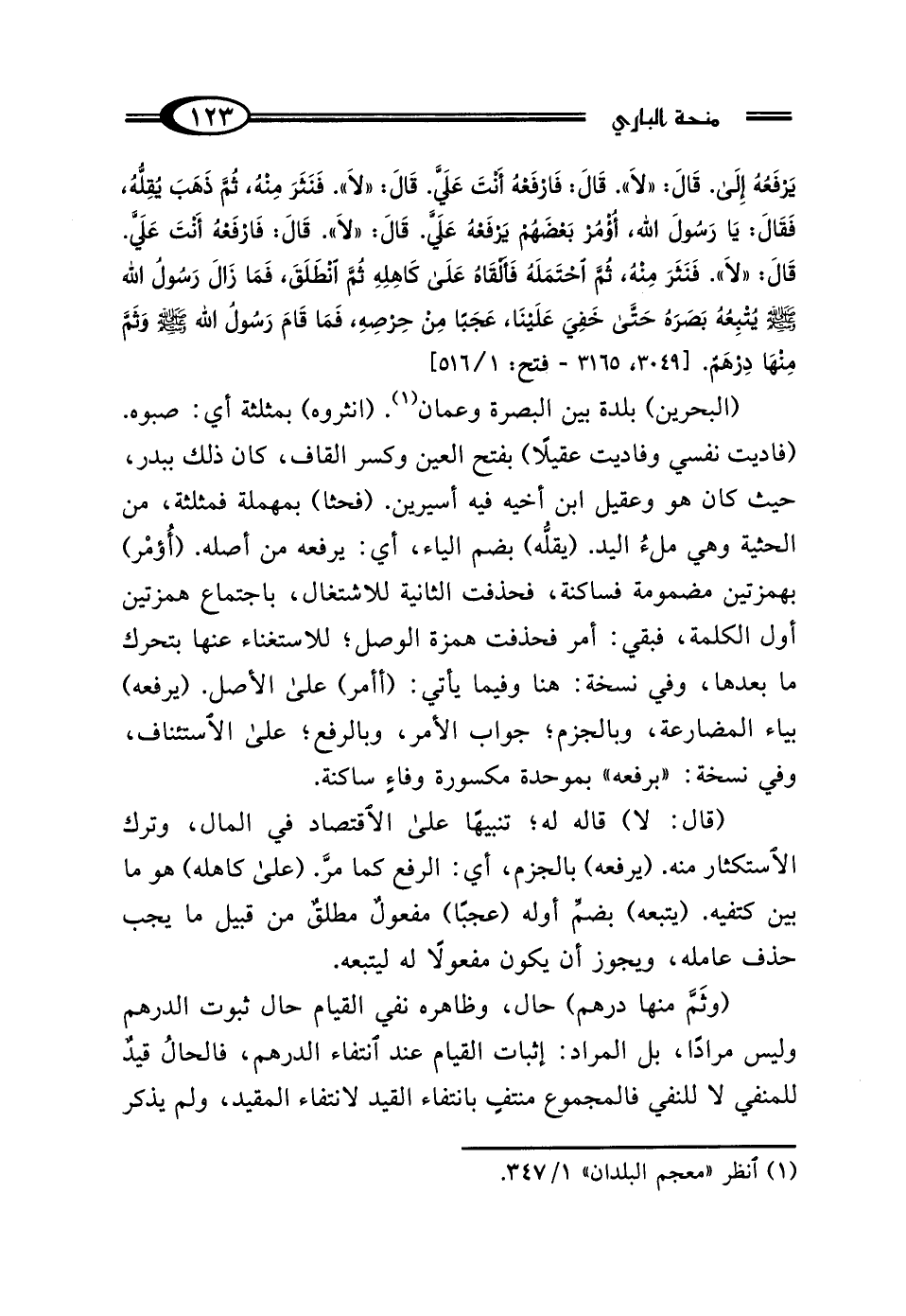 (البحرين) بلدة بين البصرة وعمان (¬1). (انثروه) بمثلثة أي: صبوه. (فاديت نفسي وفاديت عقيلًا) بفتح العين وكسر القاف، كان ذلك ببدر، حيث كان هو وعقيل ابن أخيه فيه أسيرين. (فحثا) بمهملة فمثلثة، من الحثية وهي ملءُ اليد. (يقلُّه) بضم الياء، أي: يرفعه من أصله. (أُؤمْر) بهمزتين مضمومة فساكنة، فحذفت الثانية للاشتغال، باجتماع همزتين أول الكلمة، فبقي: أمر فحذفت همزة الوصل؛ للاستغناء عنها بتحرك ما بعدها، وفي نسخة: هنا وفيما يأتي: (أأمر) على الأصل. (يرفعه) بياء المضارعة، وبالجزم؛ جواب الأمر، وبالرفع؛ على الاستئناف، وفي نسخة: "برفعه" بموحدة مكسورة وفاءٍ ساكنة.