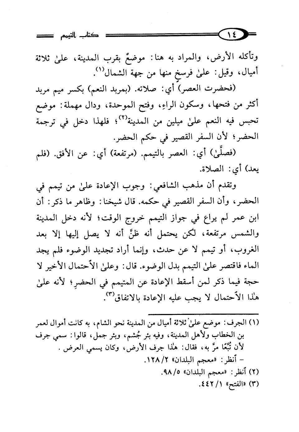 وتقدم أن مذهب الشافعي: وجوب الإعادة على من تيمم في الحضر، وأن السفر القصير في حكمه. قال شيخنا: وظاهر ما ذكر: أن ابن عمر لم يراع في جواز التيمم خروج الوقت؛ لأنه دخل المدينة والشمس مرتفعة، لكن يحتمل أنه ظنَّ أنه لا يصل إليها إلا بعد الغروب، أو تيمم لا عن حدث، وإنما أراد تجديد الوضوء فلم يجد الماء فاقتصر على التيمم بدل الوضوء. قال: وعلى الاحتمال الأخير لا حجة فيما ذكر لمن أسقط الإعادة عن المتيمم في الحضرِ؛ لأنه على هذا الاحتمال لا يجب عليه الإعادة بالاتفاق (¬3).