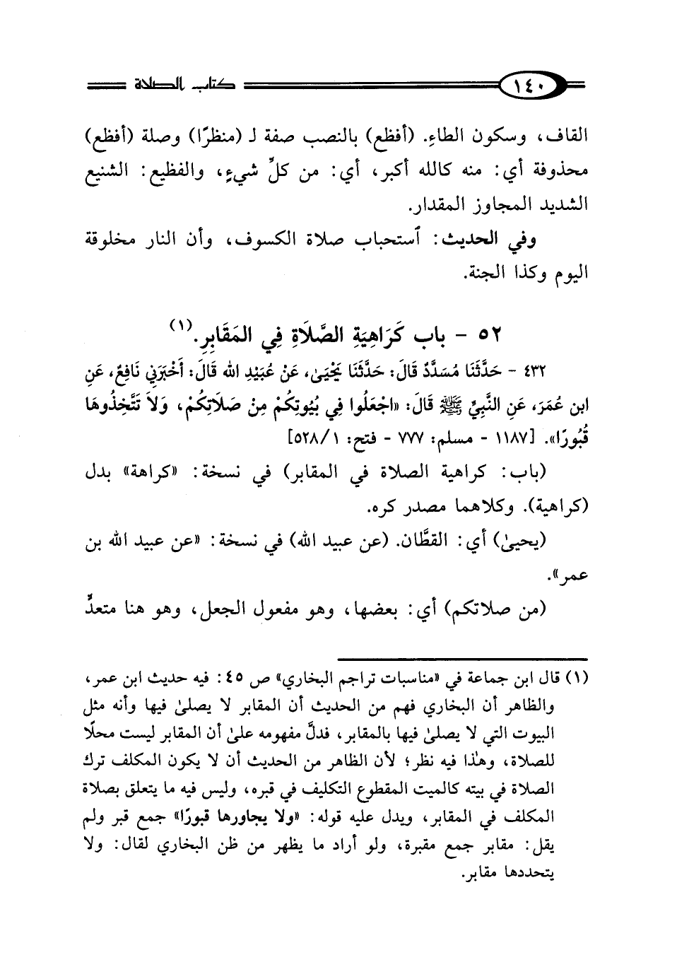 (¬1) قال ابن جماعة في "مناسبات تراجم البُخاريّ" ص 45: فيه حديث ابن عمر، والظاهر أن البُخاريّ فهم من الحديث أن المقابر لا يصلَّى فيها وأنه مثل البيوت التي لا يصلى فيها بالمقابر، فدلَّ مفهومه على أن المقابر ليست محلًا للصلاة، وهذا فيه نظرة لأنَّ الظاهر من الحديث أن لا يكون المكلف ترك الصلاة في بيته كالميت المقطوع التكليف في قبره، وليس فيه ما يتعلق بصلاة المكلف في المقابر، ويدل عليه قوله: "ولا يجاورها قبورًا" جمع قبر ولم يقل: مقابر جمع مقبرة، ولو أراد ما يظهر من ظن البُخاريّ لقال: ولا يتحددها مقابر.