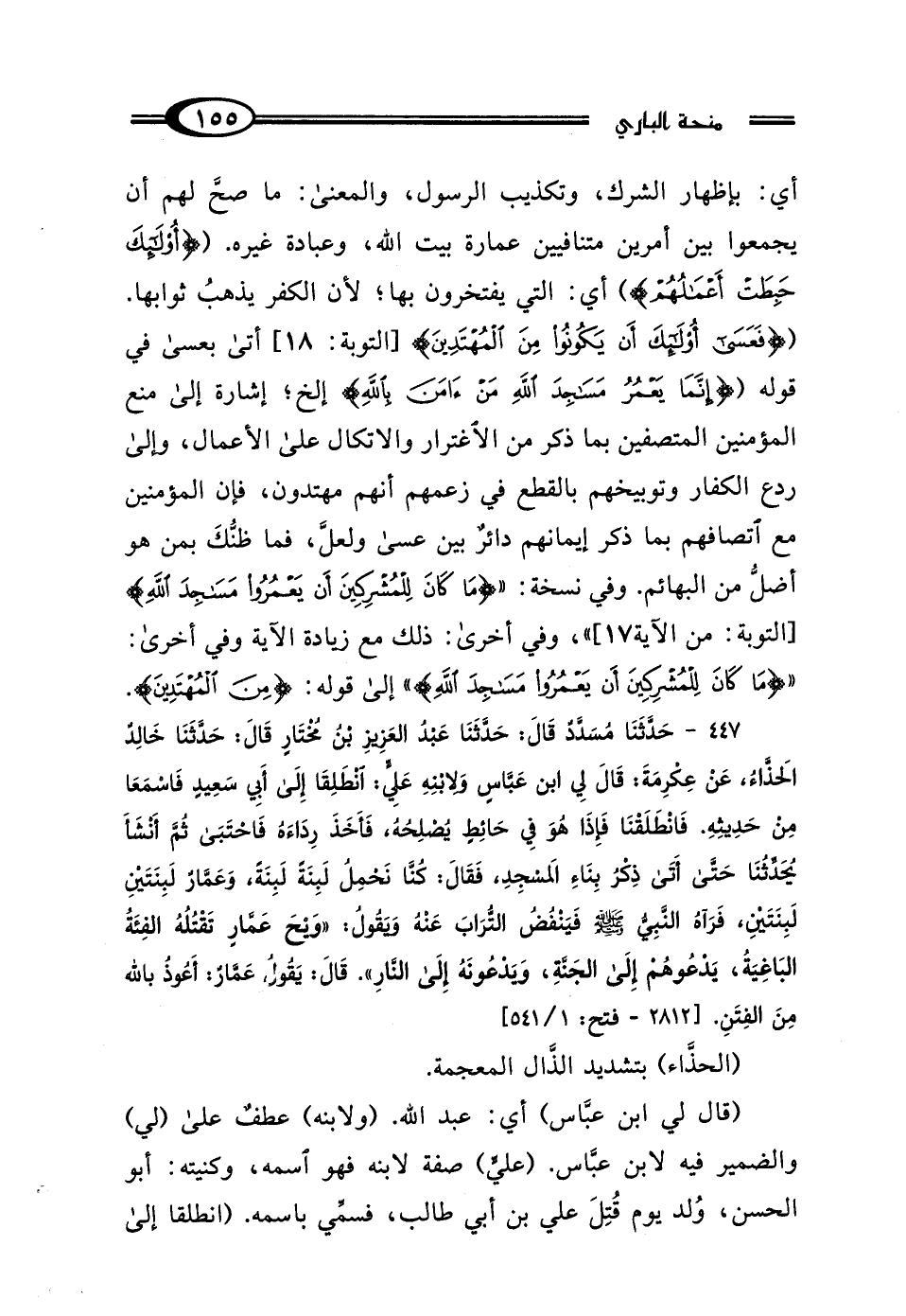 أي: بإظهار الشرك، وتكذيب الرسول، والمعنى: ما صحَّ لهم أن يجمعوا بين أمرين متنافيين عمارة بيت الله، وعبادة غيره. ({أُولَئِكَ حَبِطَتْ أَعْمَالُهُمْ}) أي: التي يفتخرون بها؛ لأنَّ الكفر يذهبُ ثوابها. ({فَعَسَى أُولَئِكَ أَنْ يَكُونُوا مِنَ الْمُهْتَدِينَ} [التوبة: 18] أتى بعسى في قوله ({إِنَّمَا يَعْمُرُ مَسَاجِدَ اللَّهِ مَنْ آمَنَ بِاللَّهِ} إلخ؛ إشارة إلى منع المؤمنين المتصفين بما ذكر من الاغترار والاتكال على الأعمال، وإلى ردع الكفار وتوبيخهم بالقطع في زعمهم أنهم مهتدون، فإن المؤمنين مع اتصافهم بما ذكر إيمانهم دائرٌ بين عسى ولعلَّ، فما ظنُّكَ بمن هو أضلُّ من البهائم. وفي نسخة: {مَا كَانَ لِلْمُشْرِكِينَ أَنْ يَعْمُرُوا مَسَاجِدَ اللَّهِ} [التوبة: من الآية 17] "، وفي أخرى: ذلك مع زيادة الآية وفي أخرى: " {مَا كَانَ لِلْمُشْرِكِينَ أَنْ يَعْمُرُوا مَسَاجِدَ اللَّهِ} " إلى قوله: {مِنَ الْمُهْتَدِينَ}.