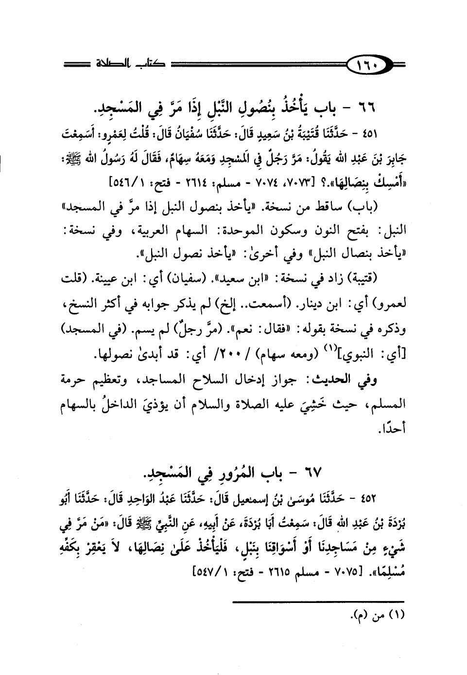 451 - حَدَّثَنَا قُتَيْبَةُ بْنُ سَعِيدٍ، قَالَ: حَدَّثَنَا سُفْيَانُ، قَالَ: قُلْتُ لِعَمْرٍو: أَسَمِعْتَ جَابِرَ بْنَ عَبْدِ اللَّهِ يَقُولُ: مَرَّ رَجُلٌ فِي المَسْجِدِ وَمَعَهُ سِهَامٌ، فَقَالَ لَهُ رَسُولُ اللَّهِ صَلَّى اللهُ عَلَيْهِ وَسَلَّمَ: "أَمْسِكْ بِنِصَالِهَا"؟.