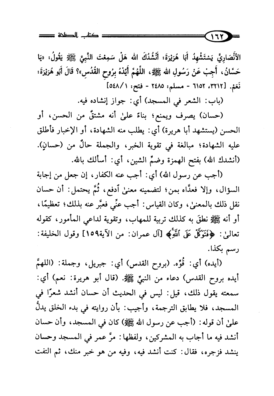 الأَنْصَارِيَّ، يَسْتَشْهِدُ أَبَا هُرَيْرَةَ: أَنْشُدُكَ اللَّهَ، هَلْ سَمِعْتَ النَّبِيَّ صَلَّى اللهُ عَلَيْهِ وَسَلَّمَ يَقُولُ: "يَا حَسَّانُ، أَجِبْ عَنْ رَسُولِ اللَّهِ صَلَّى اللهُ عَلَيْهِ وَسَلَّمَ، اللَّهُمَّ أَيِّدْهُ بِرُوحِ القُدُسِ" قَالَ أَبُو هُرَيْرَةَ: نَعَمْ.