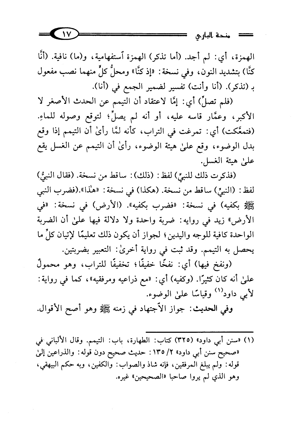 (فذكرت ذلك للنبيِّ) لفظ: (ذلك): ساقط من نسخة. (فقال النبيُّ) لفظ: (النبيِّ) ساقط من نسخة. (هكذا) في نسخة: "هذا". (فضرب النبي صلى الله عليه وسلم بكفيه) في نسخة: "فضرب بكفيه". (الأرض) في نسخة: "في الأرض" زيد في روايه: ضربة واحدة ولا دلالة فيها على أن الضربة الواحدة كافية للوجه واليدين؛ لجواز أن يكون ذلك تعليمًا لإتيان كلِّ ما يحصل به التيمم. وقد ثبت في رواية أخرى: التعبير بضربتين.