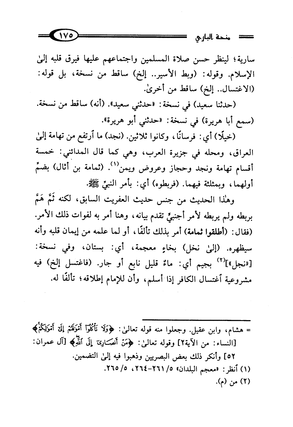 وهذا الحديث من جنس حديث العفريت السابق، لكنه ثَمَّ هَمَّ بربطه ولم يربطه لأمر أجنبيٍّ تقدم بيانه، وهنا أمر به لفوات ذلك الأمر. (فقال: (أطلقوا ثمامة) أمر بذلك تالفًا، أو لما علمه من إيمان قلبه وأنه سيظهره. (إلى نخل) بخاءٍ معجمة؛ أي: بستان، وفي نسخة: ["نجل"] (¬2) بجيم أي: ماءٌ قليل نابع أو جار. (فاغتسل إلخ) فيه مشروعية اغتسال الكافر إذا أسلم، وأن للإمام إطلاقه؛ تألفًا له.