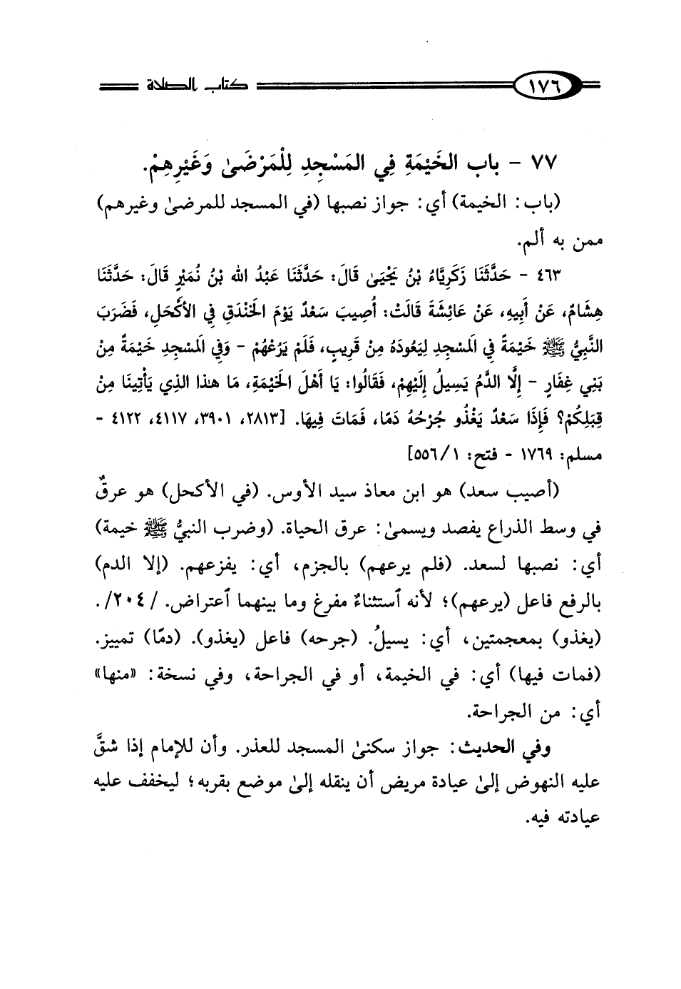 463 - حَدَّثَنَا زَكَرِيَّاءُ بْنُ يَحْيَى، قَالَ: حَدَّثَنَا عَبْدُ اللَّهِ بْنُ نُمَيْرٍ، قَالَ: حَدَّثَنَا هِشَامٌ، عَنْ أَبِيهِ، عَنْ عَائِشَةَ، قَالَتْ: أُصِيبَ سَعْدٌ يَوْمَ الخَنْدَقِ فِي الأَكْحَلِ، "فَضَرَبَ النَّبِيُّ صَلَّى اللهُ عَلَيْهِ وَسَلَّمَ خَيْمَةً فِي المَسْجِدِ، لِيَعُودَهُ مِنْ قَرِيبٍ فَلَمْ يَرُعْهُمْ" وَفِي المَسْجِدِ خَيْمَةٌ مِنْ بَنِي غِفَارٍ، إلا الدَّمُ يَسِيلُ إِلَيْهِمْ، فَقَالُوا: يَا أَهْلَ الخَيْمَةِ، مَا هَذَا الَّذِي يَأْتِينَا مِنْ قِبَلِكُمْ؟ فَإِذَا سَعْدٌ يَغْذُو جُرْحُهُ دَمًا، فَمَاتَ فِيهَا.