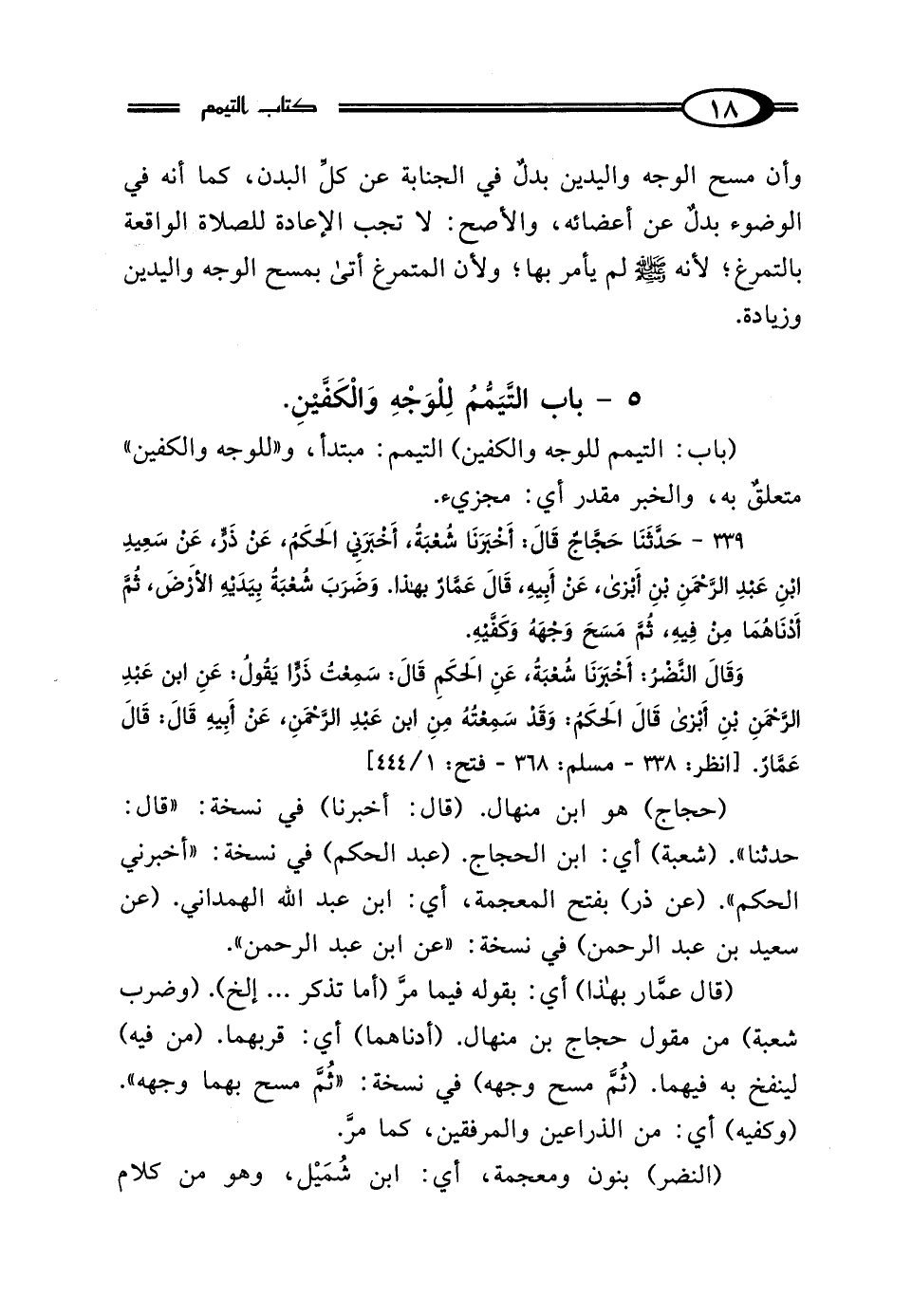 339 - حَدَّثَنَا حَجَّاجٌ، قَالَ: أَخْبَرَنَا شُعْبَةُ، أَخْبَرَنِي الحَكَمُ، عَنْ ذَرٍّ، عَنْ سَعِيدِ بْنِ عَبْدِ الرَّحْمَنِ بْنِ أَبْزَى، عَنْ أَبِيهِ، قَالَ عَمَّارٌ: "بِهَذَا وَضَرَبَ - شُعْبَةُ - بِيَدَيْهِ الأَرْضَ، ثُمَّ أَدْنَاهُمَا مِنْ فِيهِ، ثُمَّ مَسَحَ بِهِمَا وَجْهَهُ وَكَفَّيْهِ" وَقَالَ النَّضْرُ: أَخْبَرَنَا شُعْبَةُ، عَنِ الحَكَمِ، قَالَ: سَمِعْتُ ذَرًّا، يَقُولُ: عَنْ ابْنِ عَبْدِ الرَّحْمَنِ بْنِ أَبْزَى، قَالَ الحَكَمُ: وَقَدْ سَمِعْتُهُ مِنْ ابْنِ عَبْدِ الرَّحْمَنِ، عَنْ أَبِيهِ، قَالَ: قَالَ عَمَّارٌ.