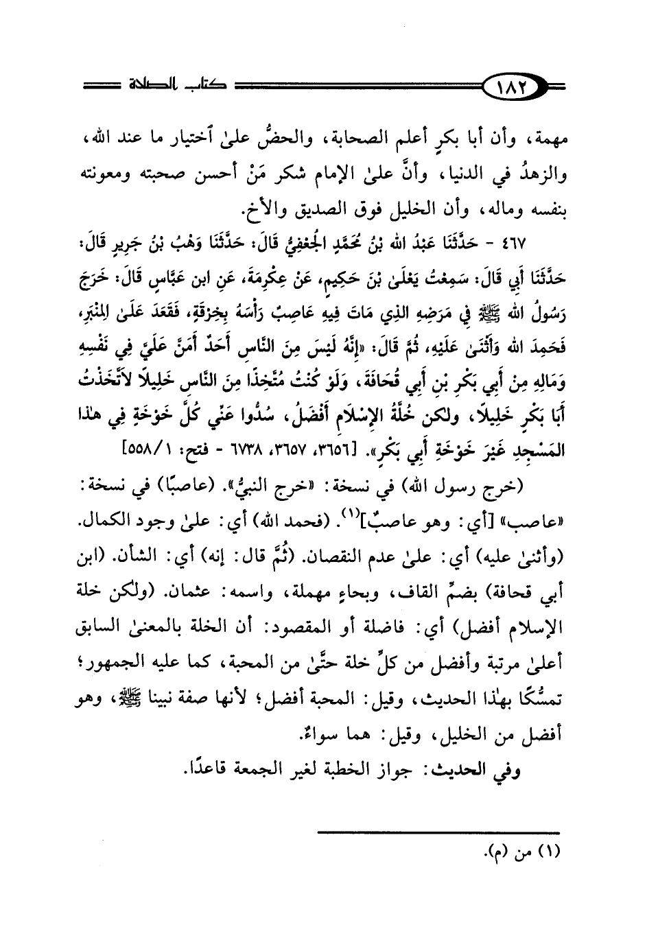 467 - حَدَّثَنَا عَبْدُ اللَّهِ بْنُ مُحَمَّدٍ الجُعْفِيُّ، قَالَ: حَدَّثَنَا وَهْبُ بْنُ جَرِيرٍ، قَالَ: حَدَّثَنَا أَبِي، قَالَ: سَمِعْتُ يَعْلَى بْنَ حَكِيمٍ، عَنْ عِكْرِمَةَ، عَنِ ابْنِ عَبَّاسٍ، قَالَ: خَرَجَ رَسُولُ اللَّهِ صَلَّى اللهُ عَلَيْهِ وَسَلَّمَ فِي مَرَضِهِ الَّذِي مَاتَ فِيهِ، عَاصِبٌ رَأْسَهُ بِخِرْقَةٍ، فَقَعَدَ عَلَى المِنْبَرِ، فَحَمِدَ اللَّهَ وَأَثْنَى عَلَيْهِ، ثُمَّ قَالَ: "إِنَّهُ لَيْسَ مِنَ النَّاسِ أَحَدٌ أَمَنَّ عَلَيَّ فِي نَفْسِهِ وَمَالِهِ مِنْ أَبِي بكْرِ بْنِ أَبِي قُحَافَةَ، وَلَوْ كُنْتُ مُتَّخِذًا مِنَ النَّاسِ خَلِيلًا لاتَّخَذْتُ أَبَا بَكْرٍ خَلِيلًا، وَلَكِنْ خُلَّةُ الإِسْلامِ أَفْضَلُ، سُدُّوا عَنِّي كُلَّ خَوْخَةٍ فِي هَذَا المَسْجِدِ، غَيْرَ خَوْخَةِ أَبِي بَكْرٍ".