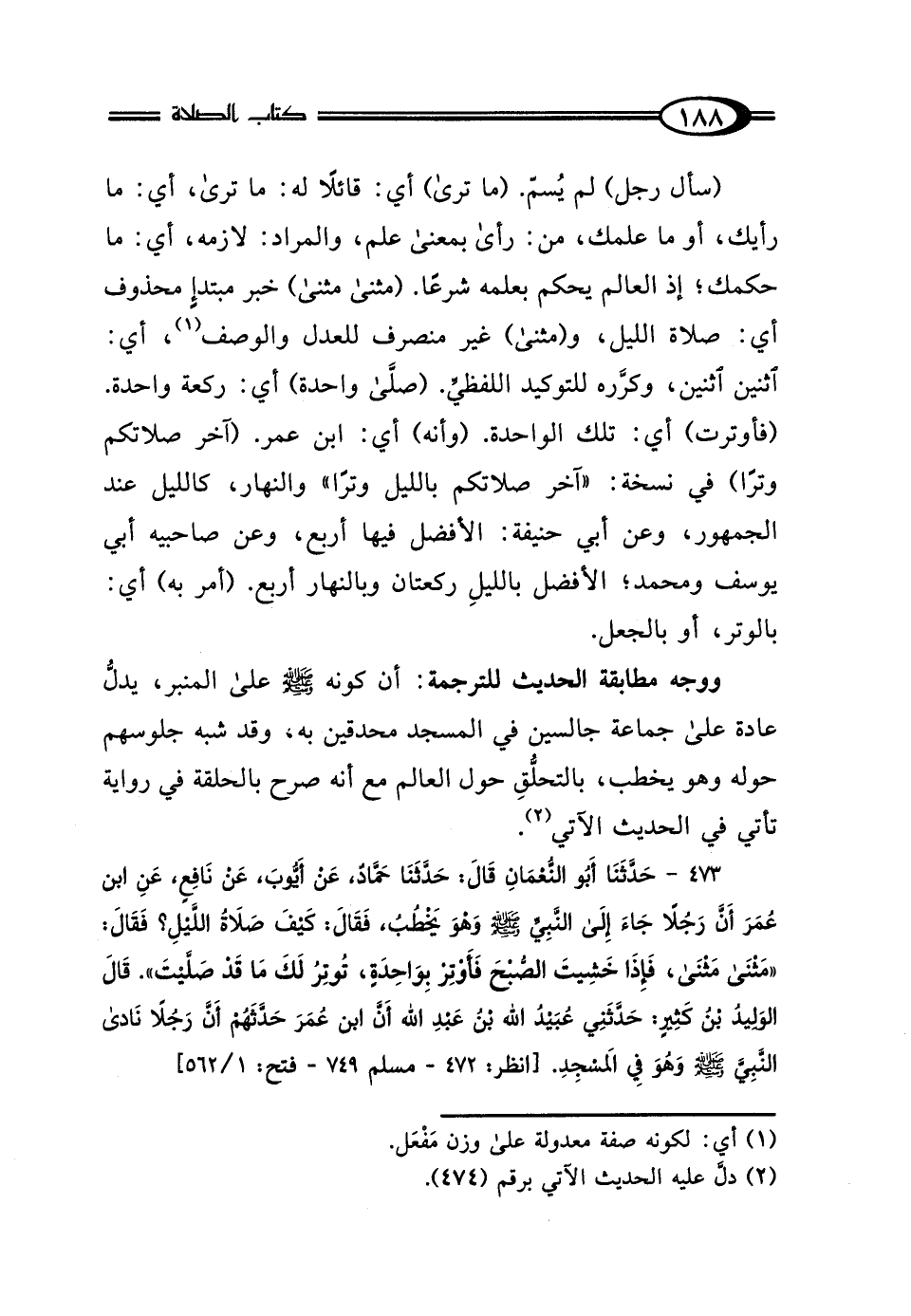 (سأل رجل) لم يُسمّ. (ما ترى) أي: قائلًا له: ما ترى، أي: ما رأيك، أو ما علمك، من: رأى بمعنى علم، والمراد: لازمه، أي: ما حكمك؛ إذ العالم يحكم بعلمه شرعًا. (مثنى مثنى) خبر مبتدإٍ محذوف أي: صلاة الليل، و (مثنى) غير منصرف للعدل والوصف (¬1)، أي: اثنين اثنين، وكرَّره للتوكيد اللفظي. (صلَّى واحدة) أي: ركعة واحدة. (فأوترت) أي: تلك الواحدة. (وأنه) أي: ابن عمر. (آخر صلاتكم وترًا) في نسخة: "آخر صلاتكم بالليل وترًا" والنهار، كالليل عند الجمهور، وعن أبي حنيفة: الأفضل فيها أربع، وعن صاحبيه أبي يوسف ومحمد؛ الأفضل بالليلِ ركعتان وبالنهار أربع. (أمر به) أي: بالوتر، أو بالجعل.