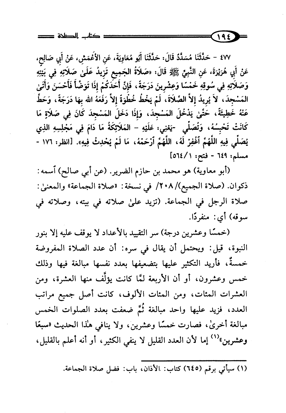 (أبو معاوية) هو محمد بن حازم الضرير. (عن أبي صالح) اسمه: ذكوان. (صلاة الجميع) في نسخة: "صلاة الجماعة" والمعنى: صلاة الرجل في الجماعة. (تزيد على صلاته في بيته، وصلاته في سوقه (أي: منفردًا.