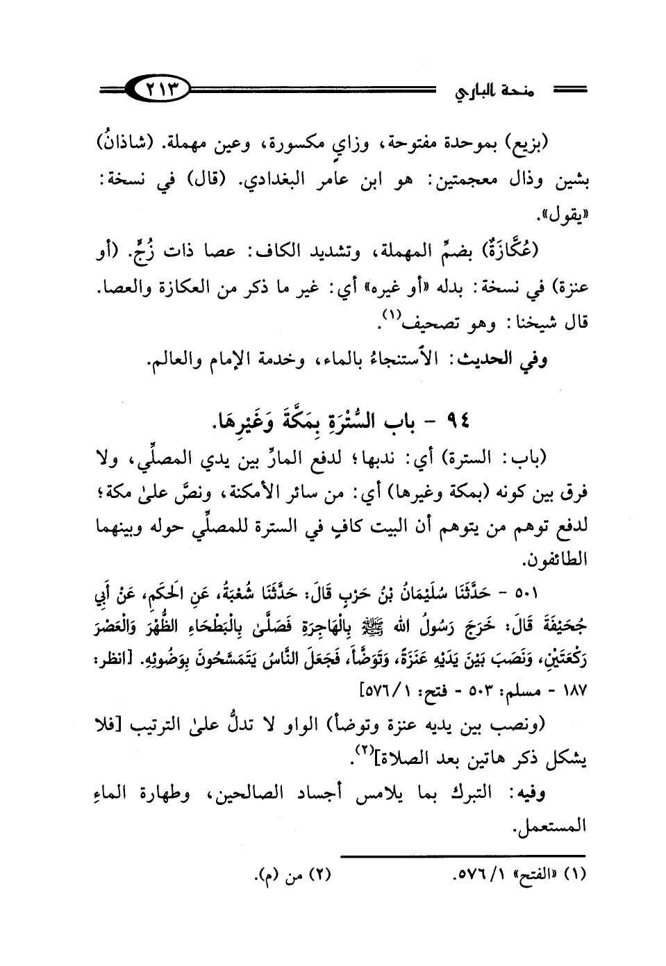 [انظر: 187 - مسلم: 503 - فتح: 1/ 576] (ونصب بين يديه عنزة وتوضأ) الواو لا تدلُّ على الترتيب أفلا يشكل ذكر هاتين بعد الصلاة] (¬2).