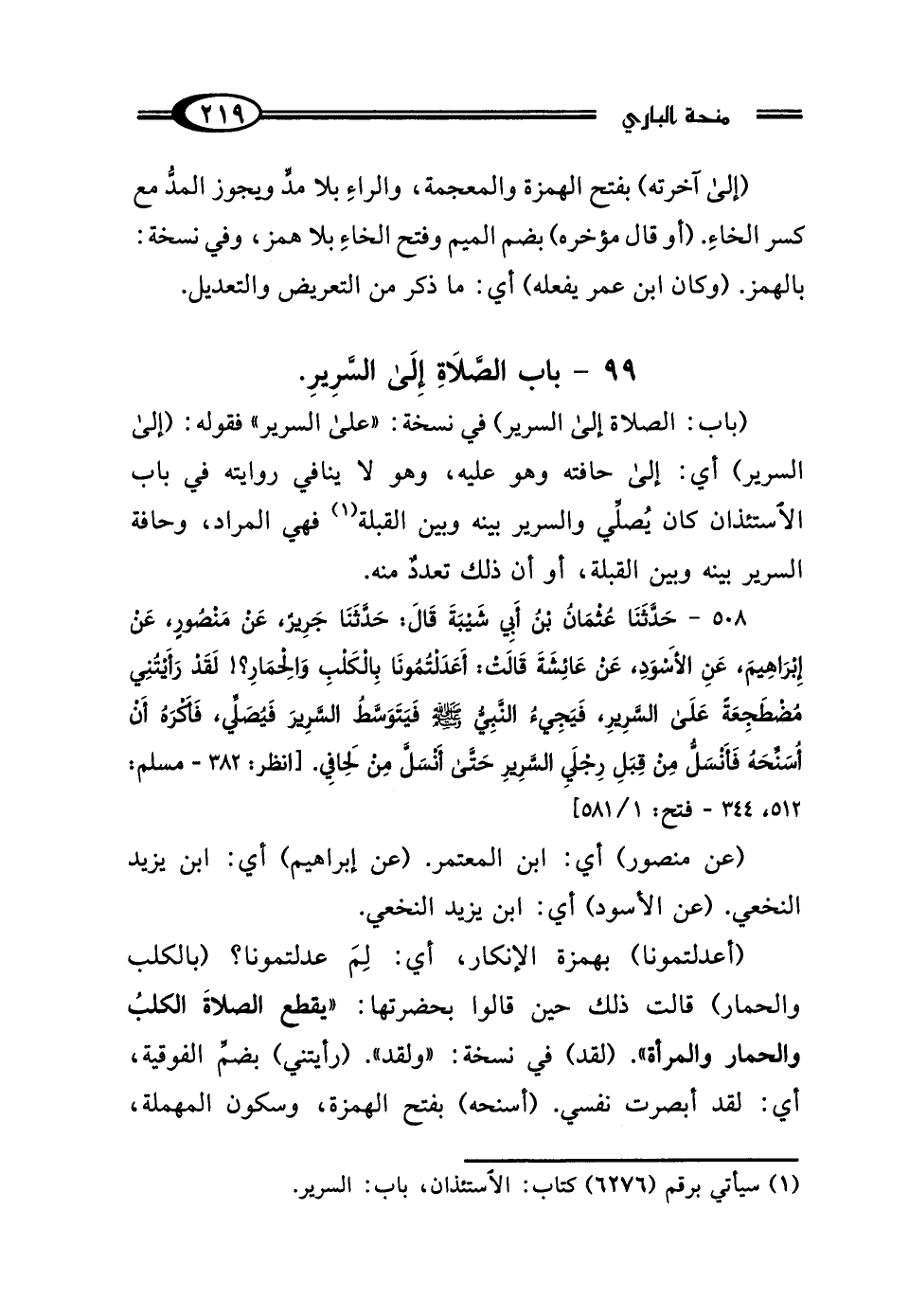 (باب: الصلاة إلى السرير) في نسخة: "على السرير" فقوله: (إلى السرير) أي: إلى حافته وهو عليه، وهو لا ينافي روايته في باب الاستئذان كان يُصلِّي والسرير بينه وبين القبلة (¬1) فهي المراد، وحافة السرير بينه وبين القبلة، أو أن ذلك تعددٌ منه.