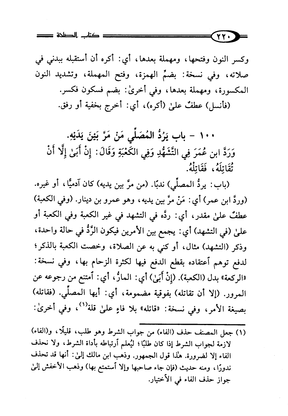 وَرَدَّ ابْنُ عُمَرَ: فِي التَّشَهُّدِ وَفِي الكَعْبَةِ، وَقَالَ: "إِنْ أَبَى إلا أَنْ تُقَاتِلَهُ فَقَاتِلْهُ".