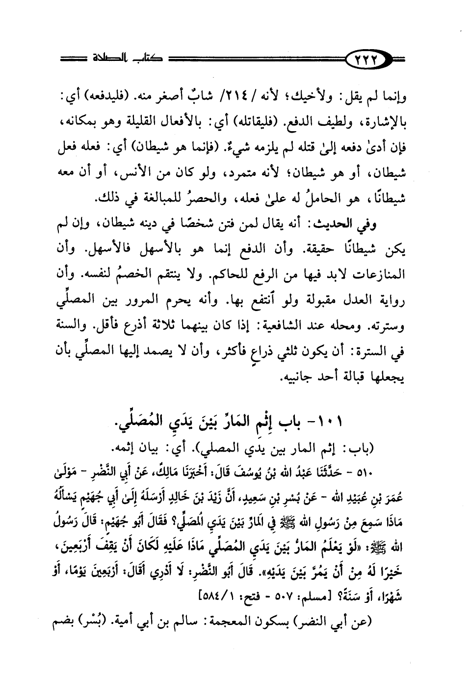 وفي الحديث: أنه يقال لمن فتن شخصًا في دينه شيطان، وإن لم يكن شيطانًا حقيقة. وأن الدفع إنما هو بالأسهل فالأسهل. وأن المنازعات لا بد فيها من الرفع للحاكم. ولا ينتقم الخصمُ لنفسه. وأن رواية العدل مقبولة ولو انتفع بها. وأنه يحرم المرور بين المصلِّي وسترته. ومحله عند الشافعية: إذا كان بينهما ثلاثة أذرع فأقل. والسنة في السترة: أن يكون ثلثي ذراعٍ فأكثر، وأن لا يصمد إليها المصلِّي بأن يجعلها قبالة أحد جانبيه.
