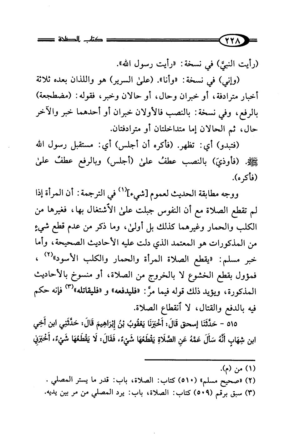 515 - حَدَّثَنَا إِسْحَاقُ بْنُ إِبْرَاهِيمَ، قَالَ: أَخْبَرَنَا يَعْقُوبُ بْنُ إِبْرَاهِيمَ بْنِ سَعْدٍ، قَالَ: حَدَّثَنِي ابْنُ أَخِي ابْنِ شِهَابٍ، أَنَّهُ سَأَلَ عَمَّهُ عَنِ الصَّلاةِ، يَقْطَعُهَا شَيْءٌ فَقَالَ لَا يَقْطَعُهَا شَيْءٌ، أَخْبَرَنِي