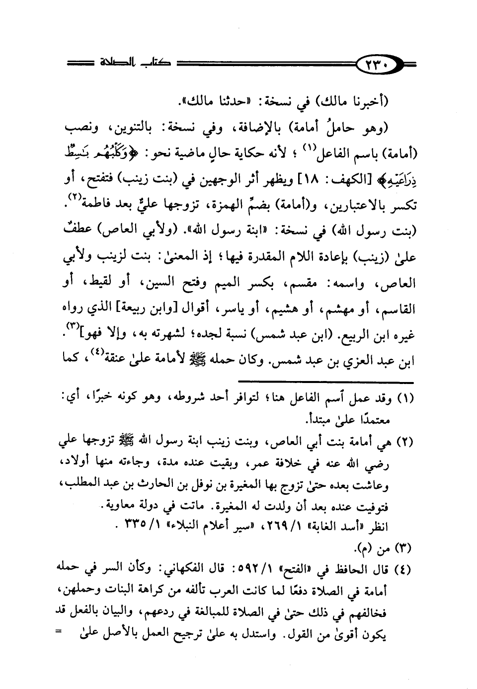 (¬4) قال الحافظ في "الفتح" 1/ 592: قال الفكهاني: وكأن السر في حمله أمامة في الصلاة دفعًا لما كانت العرب تألفه من كراهة البنات وحملهن، فخالفهم في ذلك حتى في الصلاة للمبالغة في ردعهم، والبيان بالفعل قد يكون أقوى من القول. واستدل به على ترجيح العمل بالأصل على =
