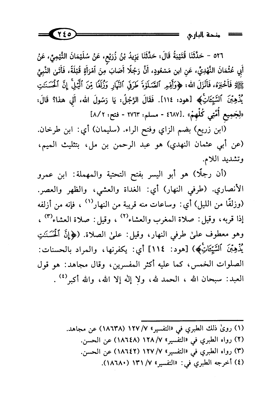 526 - حَدَّثَنَا قُتَيْبَةُ، قَالَ: حَدَّثَنَا يَزِيدُ بْنُ زُرَيْعٍ، عَنْ سُلَيْمَانَ التَّيْمِيِّ، عَنْ أَبِي عُثْمَانَ النَّهْدِيِّ، عَنِ ابْنِ مَسْعُودٍ، أَنَّ رَجُلًا أَصَابَ مِنَ امْرَأَةٍ قُبْلَةً، فَأَتَى النَّبِيَّ صَلَّى اللهُ عَلَيْهِ وَسَلَّمَ، فَأَخْبَرَهُ فَأَنْزَلَ اللَّهُ عَزَّ وَجَلَّ: {أَقِمِ الصَّلاةَ طَرَفَيِ النَّهَارِ وَزُلَفًا مِنَ اللَّيْلِ، إِنَّ الحَسَنَاتِ يُذْهِبْنَ السَّيِّئَاتِ} [هود: 114] فَقَالَ الرَّجُلُ: يَا رَسُولَ اللَّهِ أَلِي هَذَا؟ قَالَ: "لِجَمِيعِ أُمَّتِي كُلِّهِمْ".