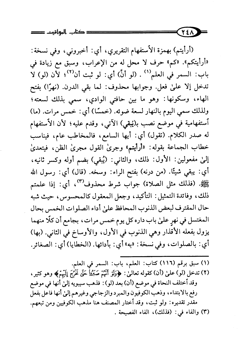 (أرأيتم) بهمزة الاستفهام التقريري، أي: أخبروني، وفي نسخة: "أرأيتكم". "كم" حرف لا محل له من الإعراب، وسبق مع زيادة في باب: السمر في العلم (¬1). (لو أنَّ) أي: لو ثبت أن (¬2)؛ لأن (لو) لا تدخل إلا على فعل. وجوابها محذوف: لما بقي الدرن. (نهرًا) بفتح الهاء، وسكونها: وهو ما بين حافتي الوادي، سمي بذلك لسعته؛ ولذلك سمي اليوم بالنهار لسعة ضوئه. (خمسًا) أي: خمس مرات. (ما) استفهامية في موضع نصب بـ (يُبقي) الآتي، وقدم عليه؛ لأن الاستفهام له صدر الكلام. (تقول) أي: أيها السامع، فالمخاطب عام، فيناسب خطاب الجماعة بقوله: "أرأيتم" وجرى القول مجرى الظن، فيتعدى إلى مفعولين: الأول: ذلك، والثاني: (يُبقي) بضم أوله وكسر ثانيه، أي: يبقي شيئًا. (من درنه) بفتح الراء: وسخه. (قال) أي: رسول الله - صلى الله عليه وسلم - (فذلك مثل الصلاة) جواب شرط محذوف (¬3)، أي: إذا علمتم ذلك، وفائدة التمثيل: التأكيد، وجعل المعقول كالمحسوس، حيث شبه حال المقترف لبعض الذنوب المحافظ على أداء الصلوات الخمس بحال المغتسل في نهرٍ على باب داره كل يوم خمس مرات، بجامع أن كلًّا منهما يزول بفعله الأقذار وهي الذنوب في الأول، والأوساخ في الثاني. (بها) أي: بالصلوات، وفي نسخة: "به" أي: بأدائها. (الخطايا) أي: الصغائر.