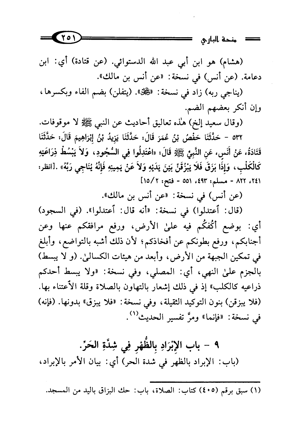 532 - حَدَّثَنَا حَفْصُ بْنُ عُمَرَ، قَالَ: حَدَّثَنَا يَزِيدُ بْنُ إِبْرَاهِيمَ، قَالَ: حَدَّثَنَا قَتَادَةُ، عَنْ أَنَسِ بْنِ مَالِكٍ، عَنِ النَّبِيِّ صلى الله عليه وسلم قَالَ: "اعْتَدِلُوا فِي السُّجُودِ، وَلَا يَبْسُطْ ذِرَاعَيْهِ كَالكَلْبِ، وَإِذَا بَزَقَ فَلَا يَبْزُقَنَّ بَيْنَ يَدَيْهِ، وَلَا عَنْ يَمِينِهِ، فَإِنَّهُ يُنَاجِي رَبَّهُ".