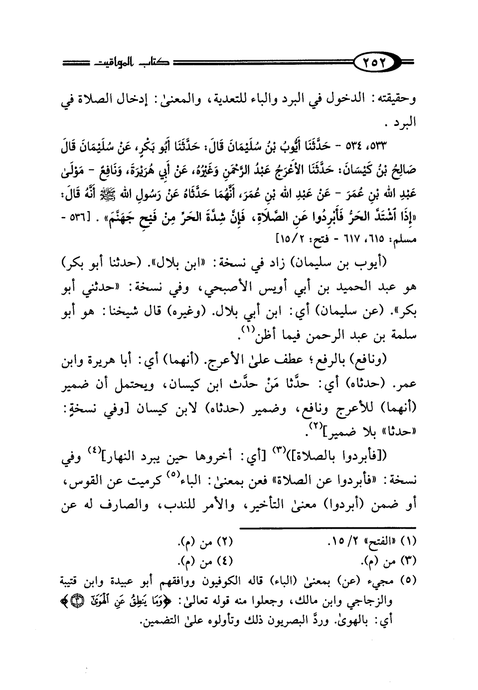 533 - حَدَّثَنَا أَيُّوبُ بْنُ سُلَيْمَانَ بْنِ بِلالٍ، قَالَ: حَدَّثَنَا أَبُو بَكْرٍ، عَنْ سُلَيْمَانَ، قَالَ: صَالِحُ بْنُ كَيْسَانَ، حَدَّثَنَا الأَعْرَجُ عَبْدُ الرَّحْمَنِ، وَغَيْرُهُ، عَنْ أَبِي هُرَيْرَةَ، وَنَافِعٌ مَوْلَى عَبْدِ اللَّهِ بْنِ عُمَرَ، عَنْ عَبْدِ اللَّهِ بْنِ عُمَرَ: أَنَّهُمَا حَدَّثَاهُ عَنْ رَسُولِ اللَّهِ صَلَّى اللهُ عَلَيْهِ وَسَلَّمَ أَنَّهُ قَالَ: "إِذَا اشْتَدَّ الحَرُّ فَأَبْرِدُوا عَنِ الصَّلاةِ، فَإِنَّ شِدَّةَ الحَرِّ مِنْ فَيْحِ جَهَنَّمَ".