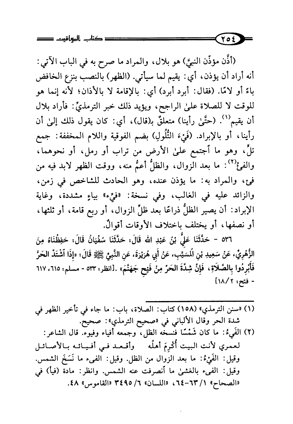 (أذَّن مؤذّن النبيِّ) هو بلال، والمراد ما صرح به في الباب الآتي: أنه أراد أن يؤذن، أي: يقيم لما سيأتي. (الظهر) بالنصب بنزع الخافض باءً أو لامًا. (فقال: أبرد أبرد) أي: بالإقامة لا بالأذان؛ لأنه إنما هو للوقت لا للصلاة على الراجح، ويؤيد ذلك خبر الترمذيّ: فأراد بلال أن يقيم (¬1). (حتَّى رأينا) متعلق بـ (قال)، أي: كان يقول ذلك إلى أن رأينا، أو بالإبراد. (فَيْءَ التُّلُولِ) بضم الفوقية واللام المخففة: جمع تل، وهو ما اجتمع على الأرض من تراب أو رمل، أو نحوهما، والفيءُ (¬2): ما بعد الزوال، والظل أعمُّ منه، ووقت الظهر لا بد فيه من فيء، والمراد به: ما يؤذن عنده، وهو الحادث للشاخص في زمن، والزائد عليه في الغالب، وفي نسخة: "فيِّء" بياءٍ مشددة، وغاية الإبراد: أن يصير الظلُّ ذراعًا بعد ظلِّ الزوال، أو ربع قامة، أو ثلثها، أو نصفها، أو يختلف باختلاف الأوقات أقوال.