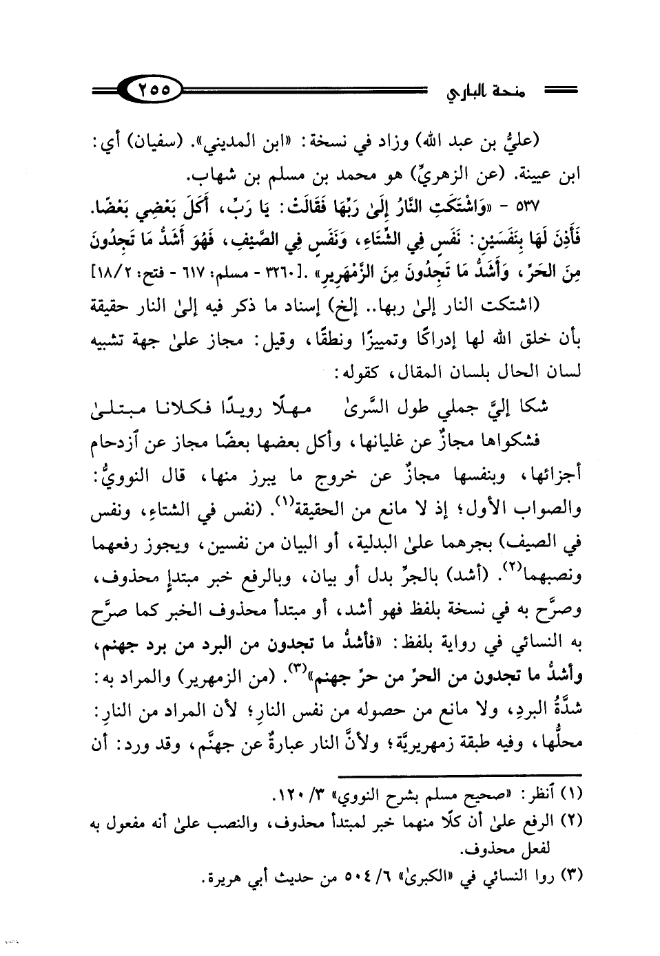 فشكواها مجازٌ عن غليانها، وأكل بعضها بعضًا مجاز عن ازدحام أجزائها، وبنفسها مجازٌ عن خروج ما يبرز منها، قال النوويُّ: والصواب الأول؛ إذ لا مانع من الحقيقة (¬1). (نفس في الشتاءِ، ونفس في الصيف) بجرهما على البدلية، أو البيان من نفسين، ويجوز رفعهما ونصبهما (¬2). (أشد) بالجر بدل أو بيان، وبالرفع خبر مبتدإِ محذوف، وصرَّح به في نسخة بلفظ فهو أشد، أو مبتدأ محذوف الخبر كما صرَّح به النسائي في رواية بلفظ: "فأشدُّ ما تجدون من البرد من برد جهنم، وأشد ما تجدون من الحر من حز جهنم" (¬3). (من الزمهرير) والمراد به: شدةُ البردِ، ولا مانع من حصوله من نفس النارِ؛ لأن المراد من النارِ: محلُّها، وفيه طبقة زمهريريَّة؛ ولأنَّ النار عبارةٌ عن جهنم، وقد ورد: أن