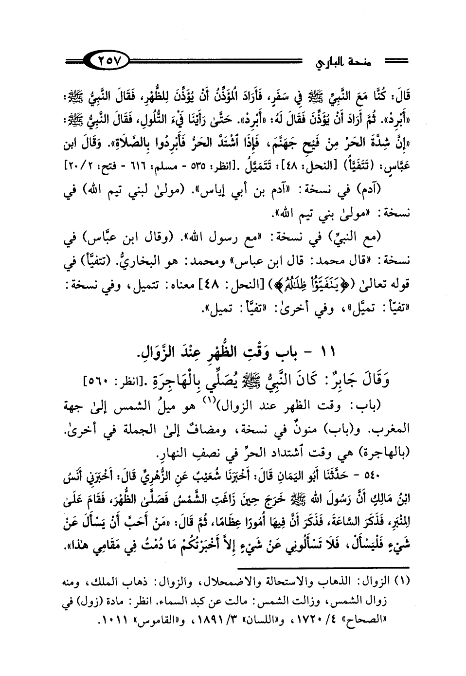 قَالَ: كُنَّا مَعَ النَّبِيِّ صَلَّى اللهُ عَلَيْهِ وَسَلَّمَ فِي سَفَرٍ، فَأَرَادَ المُؤَذِّنُ أَنْ يُؤَذِّنَ لِلظُّهْرِ، فَقَالَ النَّبِيُّ صَلَّى اللهُ عَلَيْهِ وَسَلَّمَ: "أَبْرِدْ" ثُمَّ أَرَادَ أَنْ يُؤَذِّنَ، فَقَالَ لَهُ: "أَبْرِدْ" حَتَّى رَأَيْنَا فَيْءَ التُّلُولِ، فَقَالَ النَّبِيُّ صَلَّى اللهُ عَلَيْهِ وَسَلَّمَ: "إِنَّ شِدَّةَ الحَرِّ مِنْ فَيْحِ جَهَنَّمَ، فَإِذَا اشْتَدَّ الحَرُّ فَأَبْرِدُوا بِالصَّلاةِ" وَقَالَ ابْنُ عَبَّاسٍ: " (تَتَفَيَّأُ) تَتَمَيَّلُ".