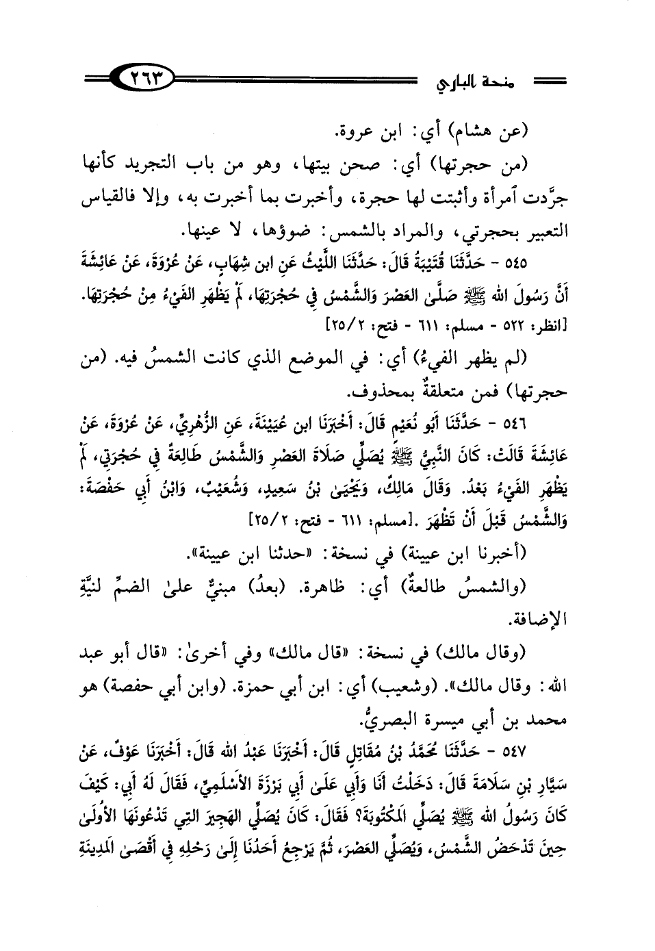 546 - حَدَّثَنَا أَبُو نُعَيْمٍ، قَالَ: أَخْبَرَنَا ابْنُ عُيَيْنَةَ، عَنِ الزُّهْرِيِّ، عَنْ عُرْوَةَ، عَنْ عَائِشَةَ، قَالَتْ: كَانَ النَّبِيُّ صَلَّى اللهُ عَلَيْهِ وَسَلَّمَ "يُصَلِّي صَلاةَ العَصْرِ وَالشَّمْسُ طَالِعَةٌ فِي حُجْرَتِي لَمْ يَظْهَرِ الفَيْءُ بَعْدُ"، وَقَالَ مَالِكٌ، وَيَحْيَى بْنُ سَعِيدٍ، وَشُعَيْبٌ، وَابْنُ أَبِي حَفْصَةَ: "وَالشَّمْسُ قَبْلَ أَنْ تَظْهَرَ".